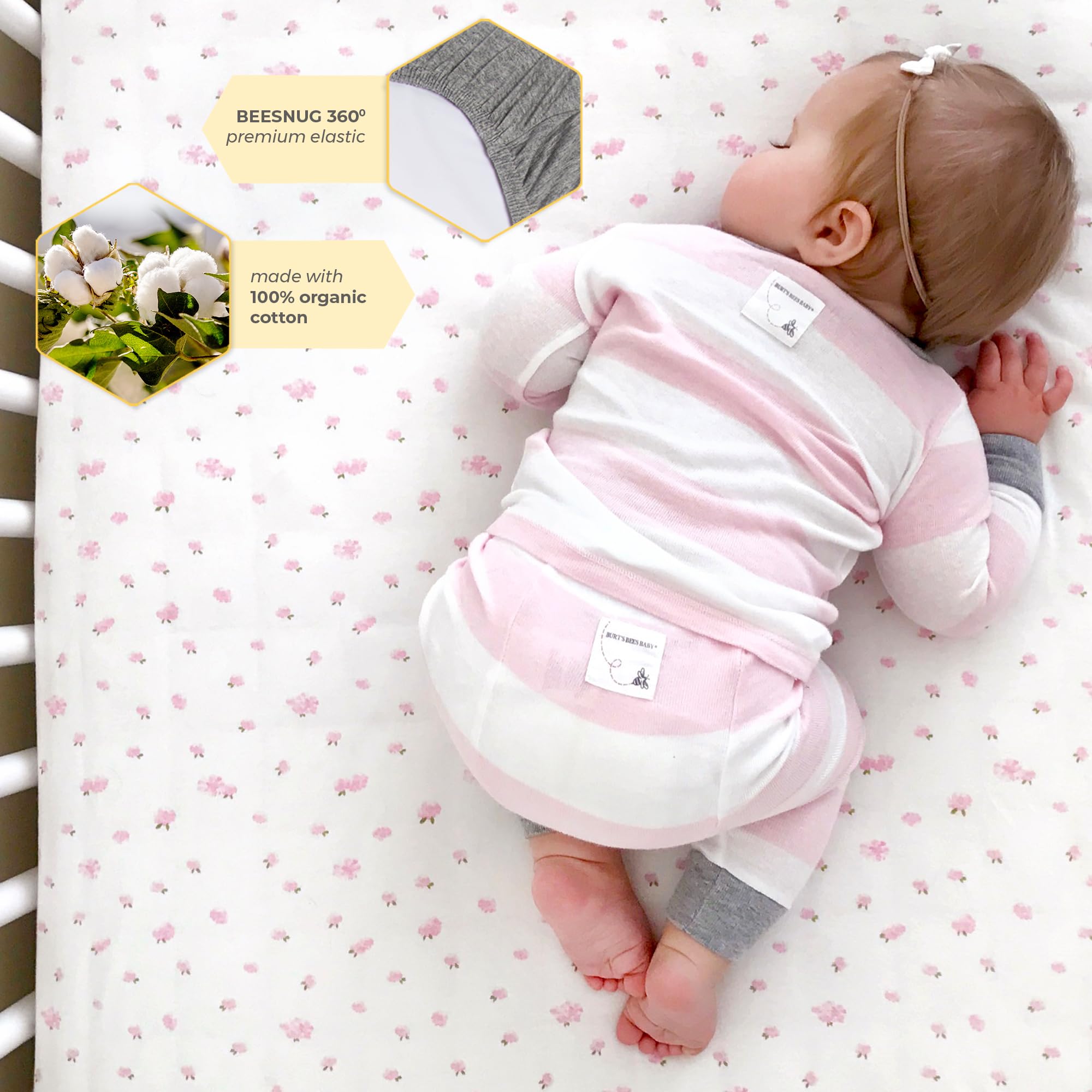 Embrace the comfort of Burt's Bees Baby Crib Sheets, a nursery and baby registry essential. Crafted with care from 100% organic cotton, each crib mattress sheet provides a soft, breathable, and cozy sanctuary for your baby’s delicate skin. These baby mattress sheets are combed and ring-spun for extra durability and are designed to promote restful sleep. Our BeeSnug 360 design ensures a snug and secure fit for standard crib and toddler mattresses, making these infant and toddler bed sheets a versatile choice for any nursery. These easy-care, machine-washable sheets become even softer with every wash while maintaining vibrant patterns. Soft & durable; makes a great daycare essential. Available in a variety of hand-painted watercolor prints for boys, girls & gender neutral little ones, our organic crib sheets make the perfect match for any nursery theme. Whether you prefer floral, animal, or modern geometric designs, you can mix and match these sheets to complement your décor. The classic jersey knit fabric gives your baby the warm, comforting feel of your favorite t-shirt, helping them transition smoothly from your arms to their crib. Check out our baby boy crib sheets, baby girl crib sheets, and neutral options. Made from 100% organic cotton, certified by CU 831717, 2024 and manufactured to GOTS standards, our fitted crib sheets ensure your little one sleeps safely and comfortably. Soft and breathable baby crib sheets, fitted crib sheets, and toddler bed sheets designed for comfort. Perfectly fits standard crib mattresses, ensuring a snug and secure sleep for your little one.