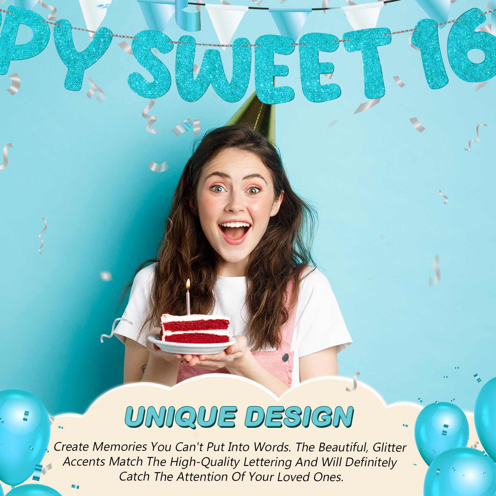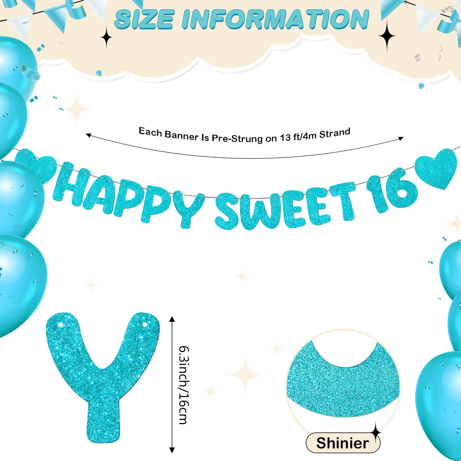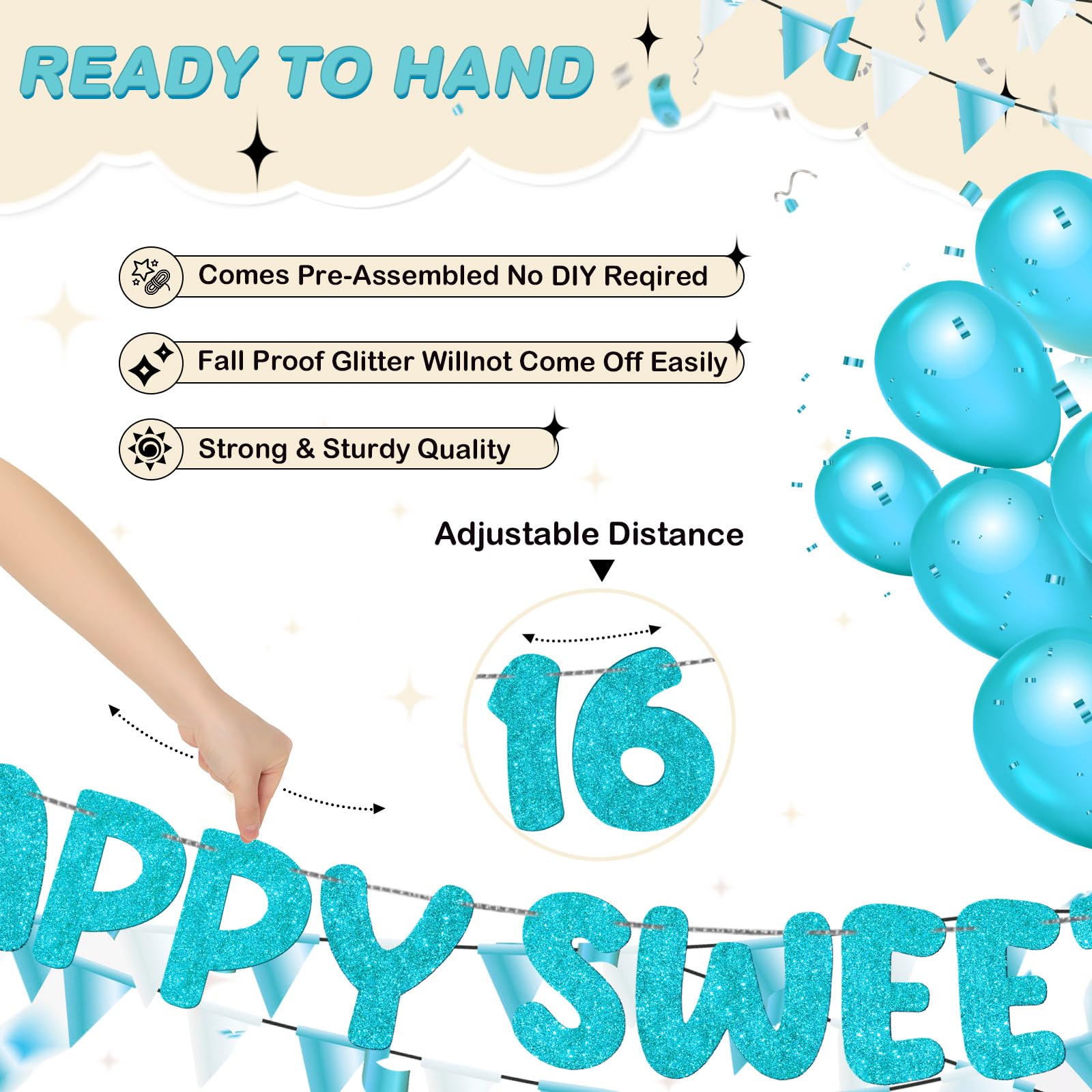 Exquisite Sky Blue Color: the tastefully chosen sky blue color adds a balance of elegance and glam to your party decorations; Happy sweet 16 birthday banner symbolizes celebration, lending a charm to the birthday event; Its sophisticated color matches well with various party themes, leaving the guests in awe and significantly enhancing the celebratory atmosphere
