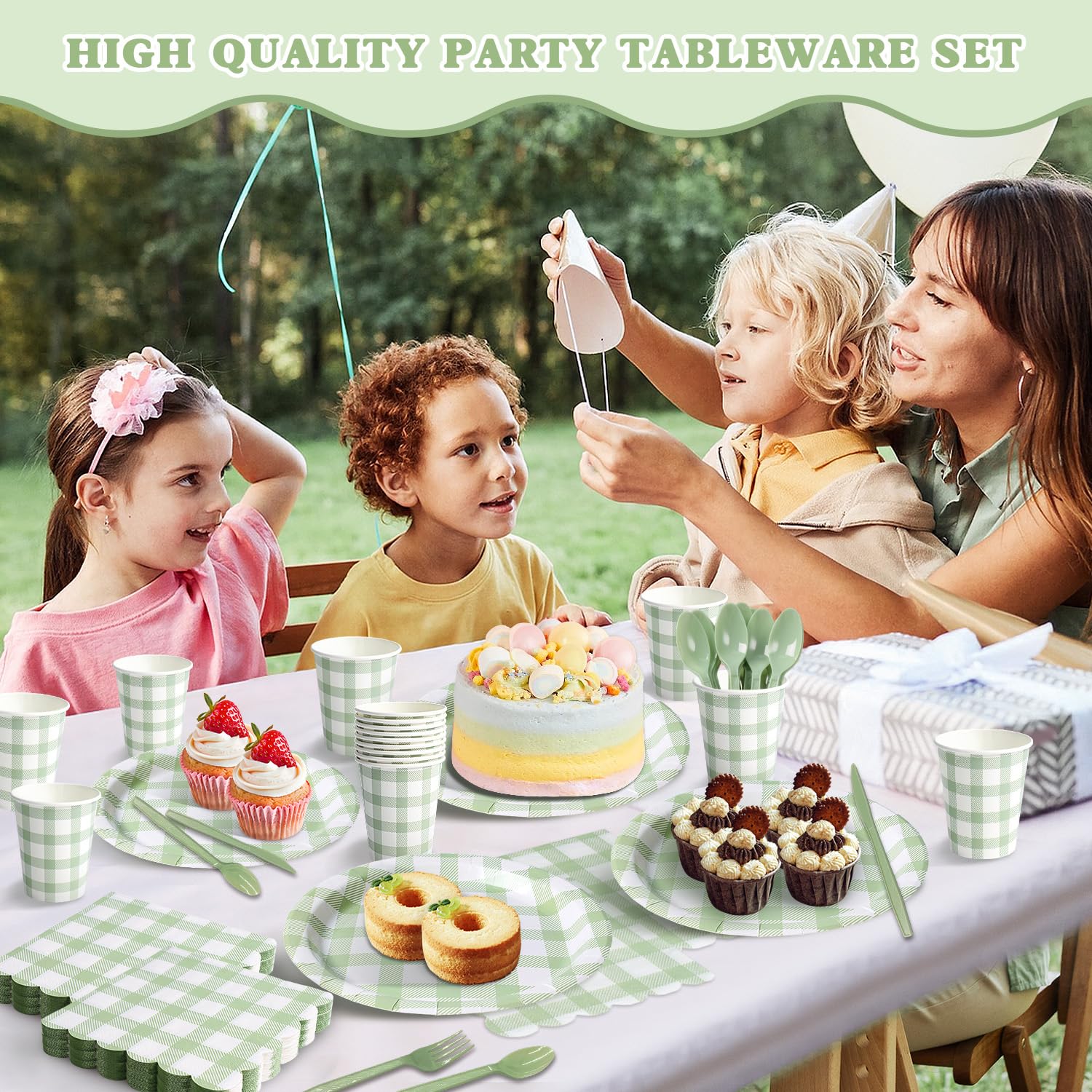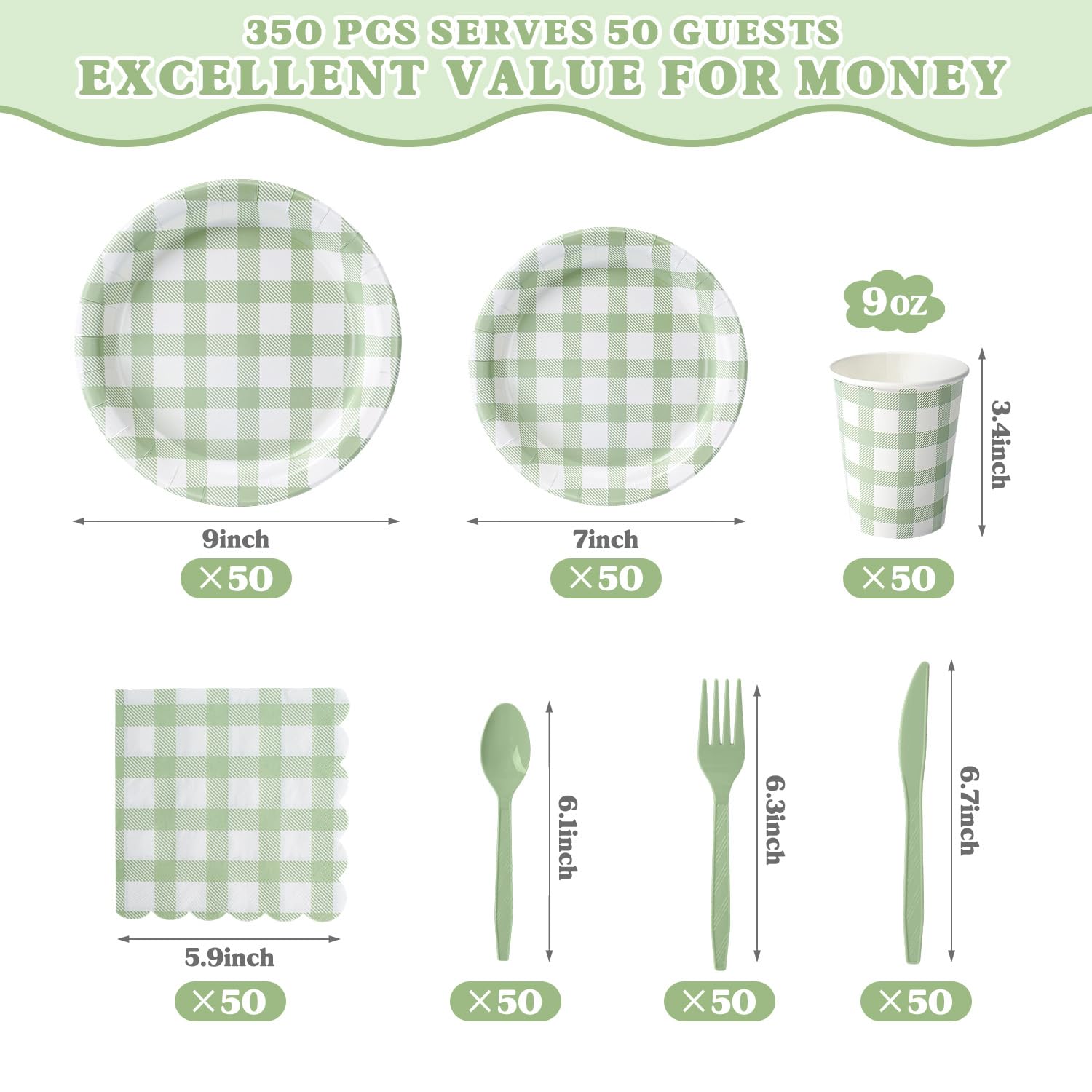 Complete Gingham Party Tableware Set (Serves 50) – Includes 50 9" dinner gingham paper plates, 50 7" dessert gingham paper plates, 50 gingham paper napkins, 50 gingham paper cups, plus 50 each plastic forks, knives & spoons (350 pieces total).