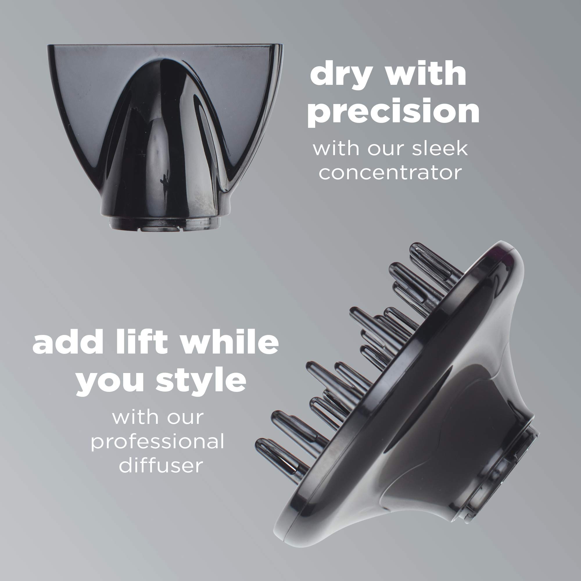 Includes: Diffuser - boosting volume and adding lift to your style. Concentrator - providing sleek, precise styling.