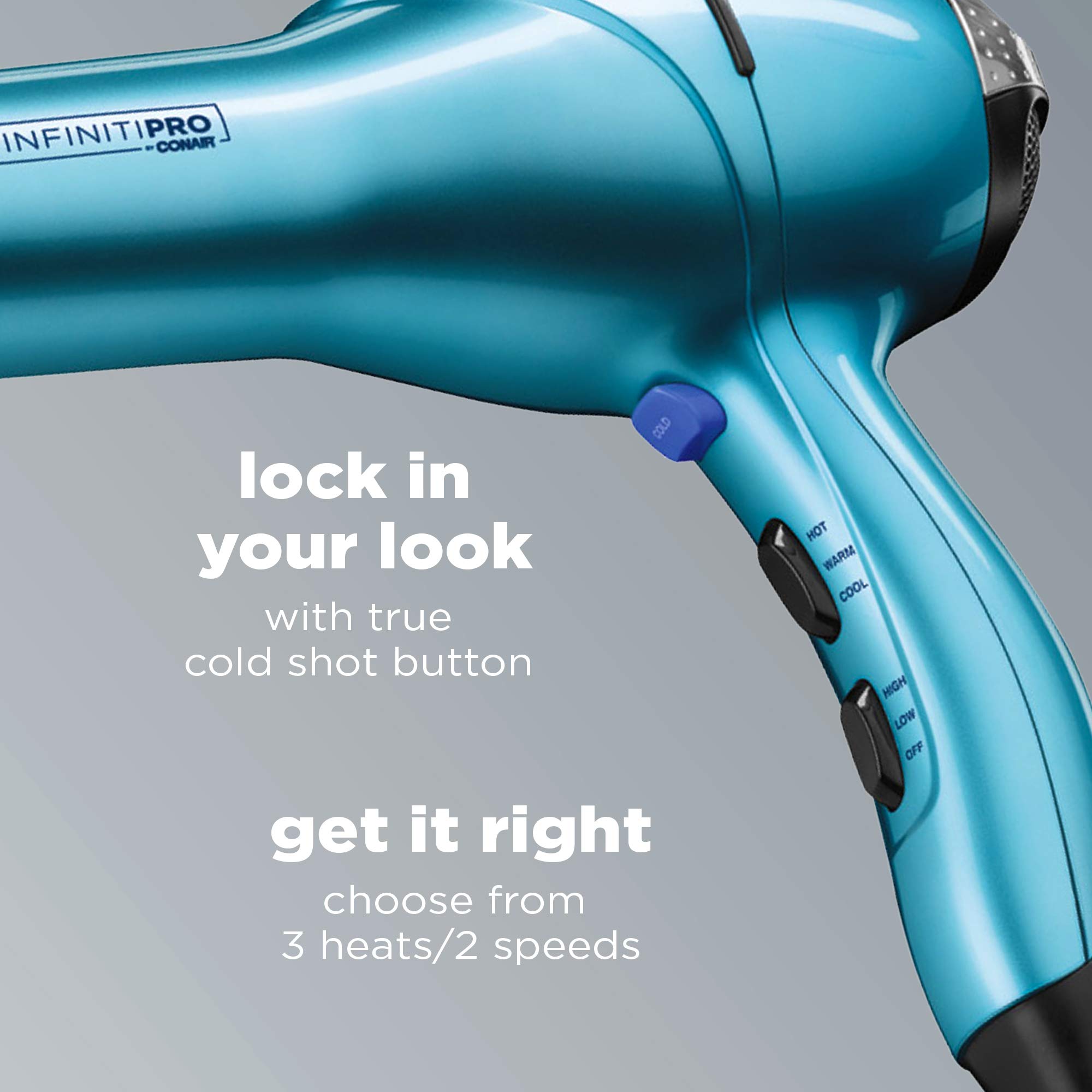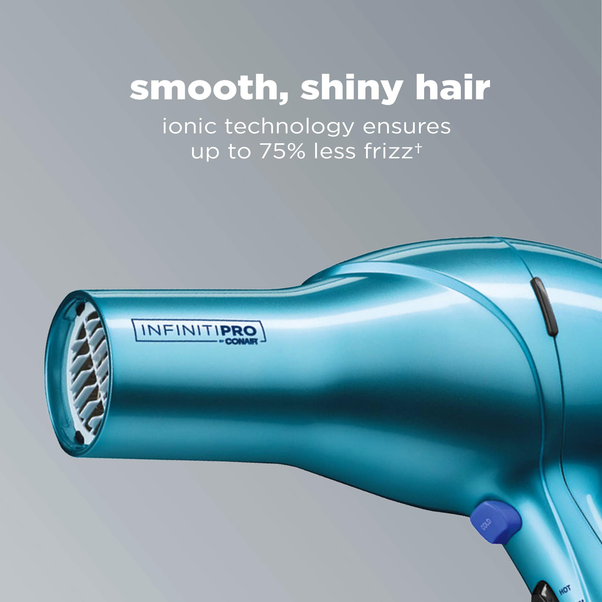 Less frizz. Pro Performance. Up to 50% faster drying. Get it all with the Quick Styling Salon Dryer from InfinitiPRO by Conair. This styling essential is your go-to for salon results at home. Get incredible volume with powerful airflow from roots to tips with a professional AC motor that lasts up to 3x longer. Want smooth, shiny hair? Ionic technology gets it done, with up to 75% less frizz. You'll dry faster with less damage because ceramic technology protects your hair with gentle infrared heat. Choose from 3 heat and 2 speed settings to get your look just right with the perfect speed and heat for your hair type. To dry with precision, attach the sleek concentrator. Prefer more lift as you style? Attach the professional diffuser. The handle is designed to fit comfortably in your hand and make styling extra easy and comfortable. Once you've got your ideal look , lock it in with the true cold shot. Salon performance made easy!