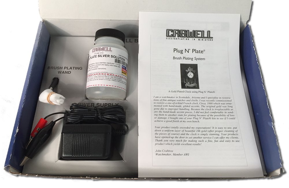 The great new way to brush plate small partsVideo: Title Using The Caswell Plug N Plate Brush Plating KitRead An Article From Mac Life Magazine On Plating An iPod Using Our Plug N' Plate® Kits (372 KB PDF)Read the Instruction Manual Here 4 Simple Steps To Brush Plate Your Small Parts1. Plug In The Adapter2. Clip the Black Lead To The Part3. Soak The Wand With Bandage In the Solution4. Brush The Wand Over The Cleaned PartPlug N' Plate® is a new concept in plating small parts. Our unique mains power pack supplies just the right amount of power allowing you to brush, and in some situations, dip plate your smaller components.The Plug N' Plate® system will also allow you to patch repair areas where the original plating has worn away.Plug N' Plate® is ideal for vintage vehicle restorers, antique collectors and dealers, and small workshops doing prototype work.What could be simpler? The Plug N' Plate® wand is attached to the red plug on the Power Pack, and the alligator clip is attached to the work-piece. The end of the wand is covered in an absorbent bandage, which is soaked in the plating solution for a few seconds.By simply stroking the part with swift brush strokes, the circuit is closed and the plating metal bearing solution goes to work, depositing its beautiful layer onto the object.Plug N' Plate® is perfect for gold plating car emblems. Simply strip the chrome off with Chrome Stripper, then apply the gold. Full instructions are included.Plug N' Plate® may be applied onto most metals. To see which kit plates onto which metal, read our instruction booklet. To plate onto Stainless Steel, use the Plug N' Plate® Copper system. When gold plating onto stainless, apply our Stainless Steel Activator For Gold with a stainless wand and 4.