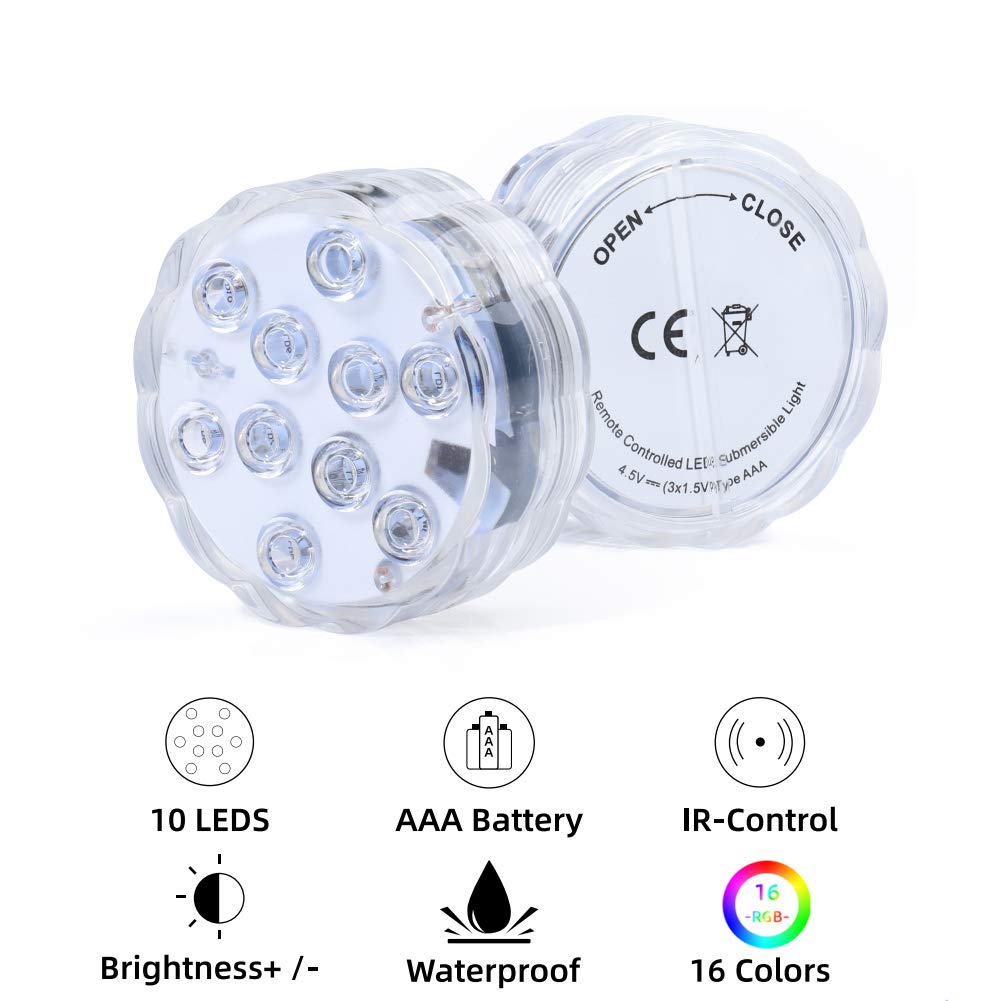 PERFORMANCE – This submersible LED light comes with 10 bright LEDs powered by 3 x AAA batteries. The light is very compact in size (2.76in / 7cm in diameter) for placement at any place. KIND REMINDER - Only use alkaline batteries. DO NOT use dry batteries, otherwise the light will possibly float.