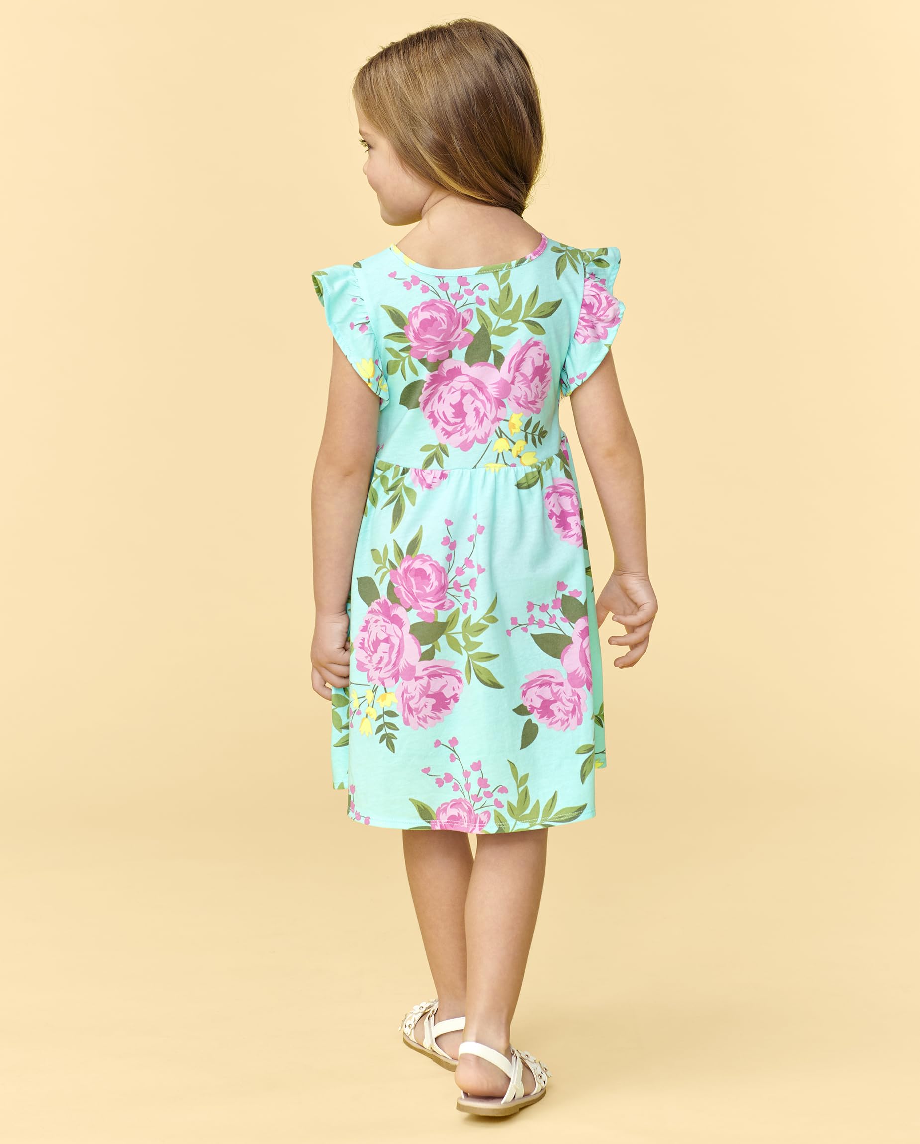DESIGN — Features short flutter sleeves, above-the-knee length and allover floral print