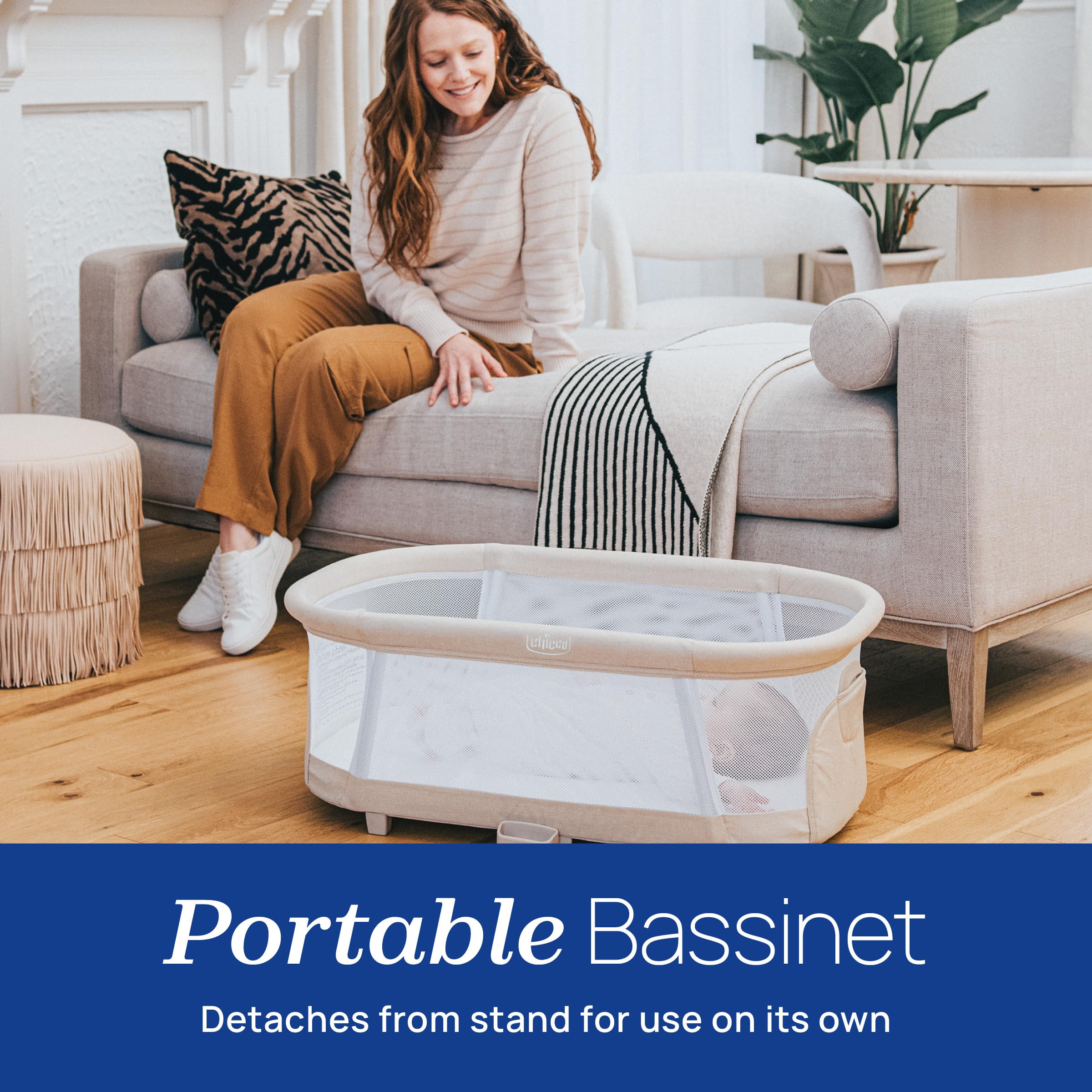 PORTABLE BASSINET: Easily detaches from stand to keep baby close throughout the home or as a baby bed when away. Travel bassinet folds flat and slides into convenient travel bag for easy portability.
