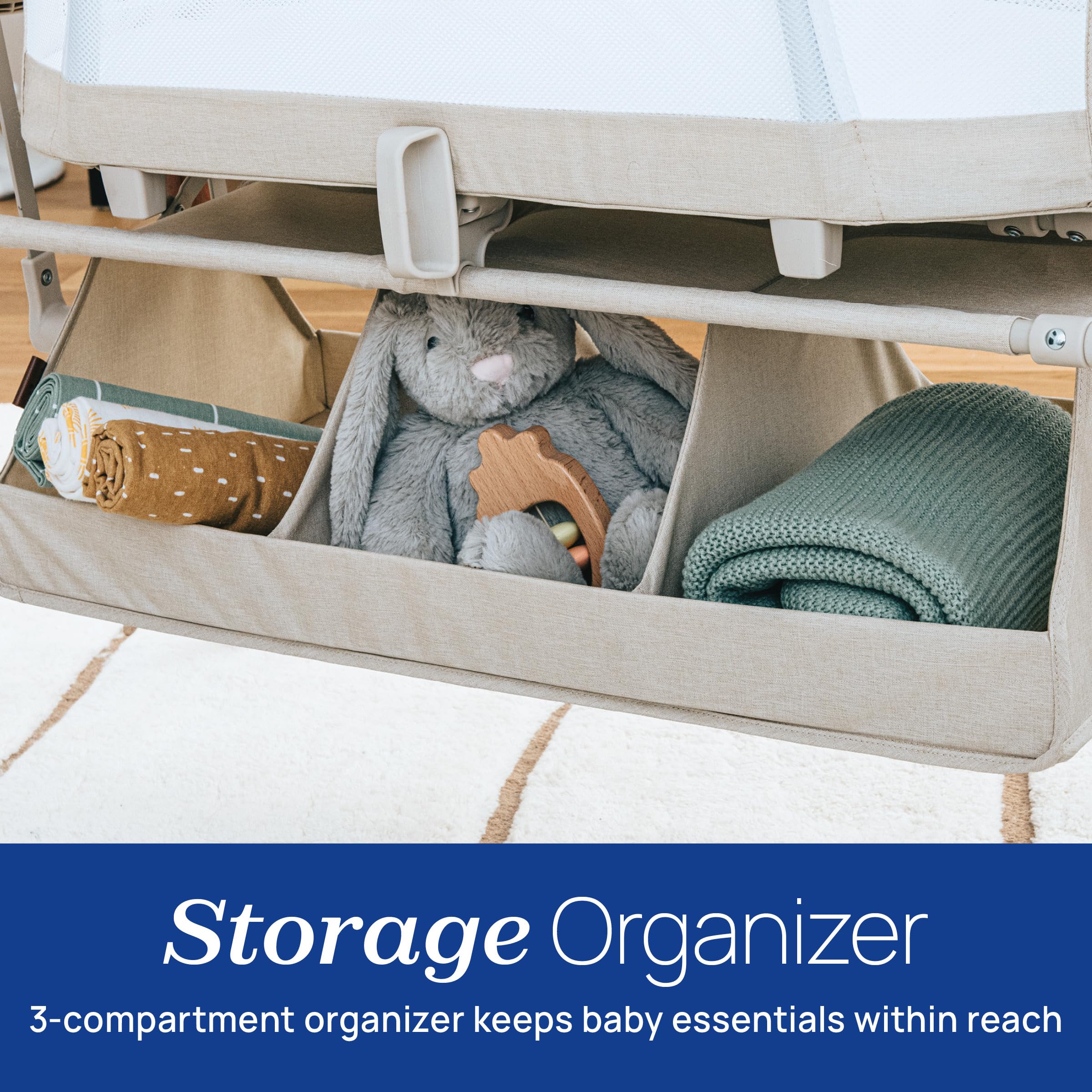 The LullaGlide Plus Electronic 3-in-1 Bassinet keeps baby close for soothing and snoozing any time of day. With breathable mesh for visibility and ventilation, the LullaGlide Plus is a cozy baby bed for your newborn to relax or sleep. The electronic console activates the gliding motion as well as nature sounds, a timer and offers Bluetooth connectivity. Parents can keep baby essentials organized with the attached 3-compartment storage organizer. Offering more versatility than a traditional bassinet, the LullaGlide Plus locks into place to use as a stationary bassinet or unlocks to become an electronic glider. The bassinet also detaches from the stand and transforms into a portable bassinet sleep space that can be used throughout the home or while traveling. The waterproof mattress with the included fitted sheet offers a firm, flat surface that is best for baby. Aesthetically pleasing with wood-grain finish legs and a sleek, streamlined design, the LullaGlide Plus complements your home and your lifestyle. The portable bassinet folds down and slides into the travel bag for an ideal travel bassinet for baby. The LullaGlide Plus Electronic 3-in-1 Bassinet is GREENGUARD Gold Certified, meaning it is independently tested for low chemical emissions, contributing to healthier air quality around baby.