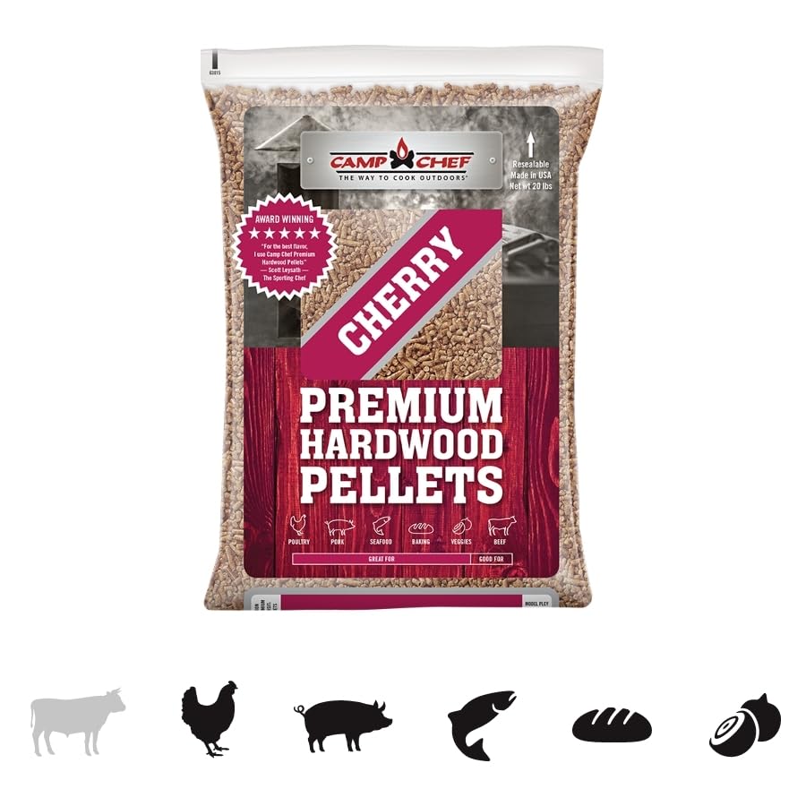 Keep your pellet grill & smoker fired up with Camp Chef premium hardwood pellets. Unlike many other brands of pellets, we use nothing but pure hardwood-no additives & no biproducts. Why? because we believe in bringing you the best flavor & most efficient burn possible. That means more time grilling & less time cleaning up ash. Try our Cherry BBQ flavor at your next cookout with chicken, pork, fish, baked goods, or fresh veggies. You can also Check out one of our other seven flavors. Use the infographic below as a guide to which flavor of pellets work best with different kinds of meats & vegetables. As you gain more experience with your pellet grill don't be afraid to experiment with different blends or flavors. In order to keep your pellet grill working at peak efficiency for years to come we recommend only using Camp Chef Brand wood pellets. Please read the instruction manual which came with your pellet grill for proper care & use or our products.