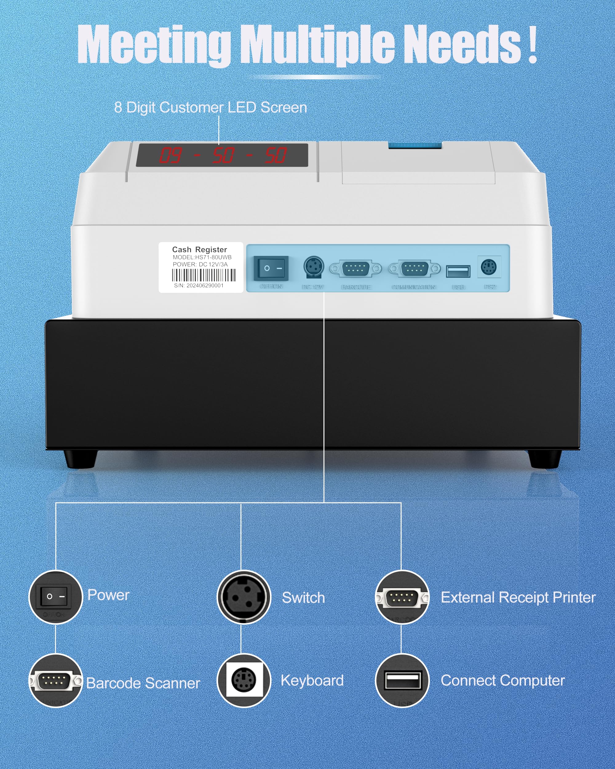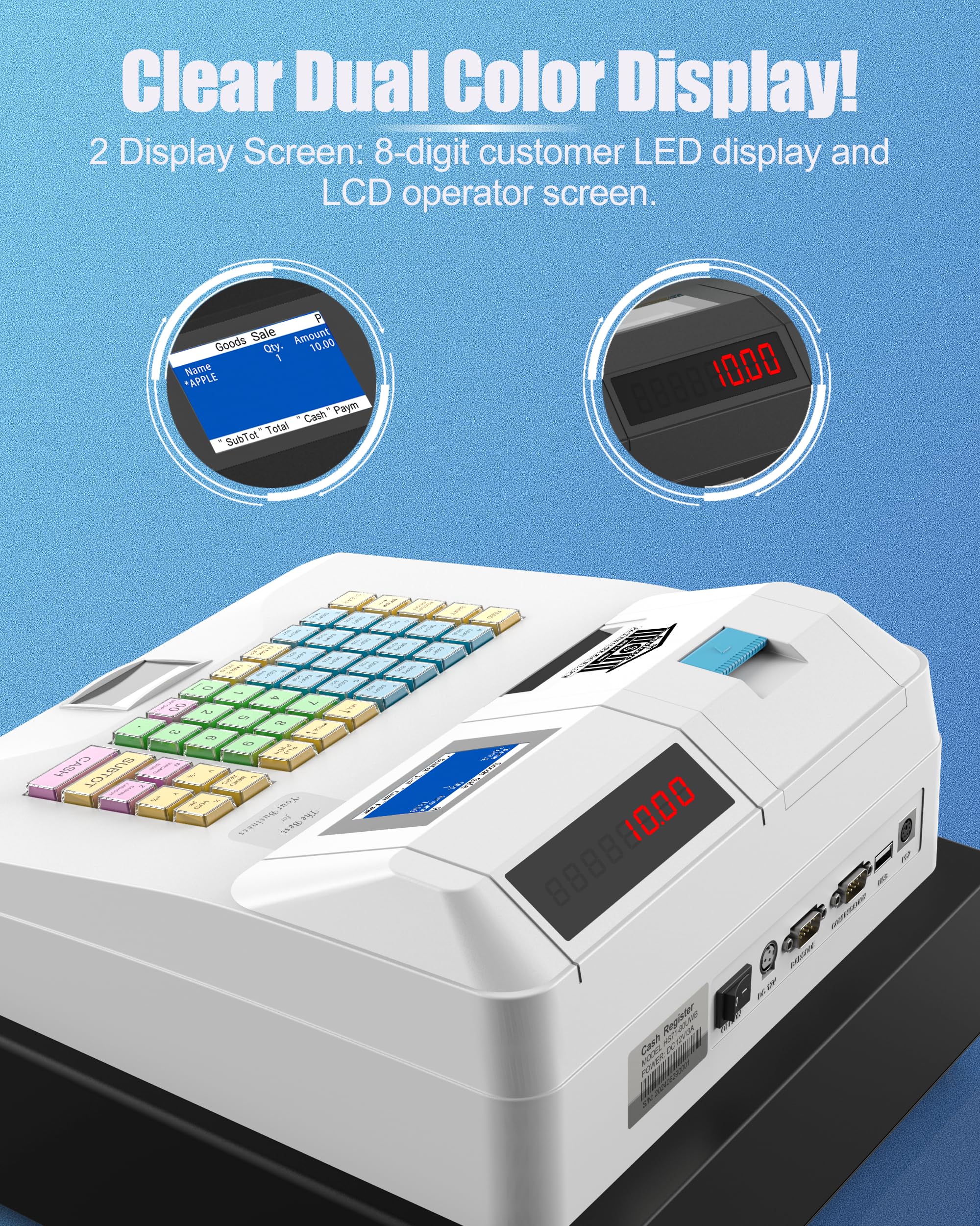 โ ใ๐๐ฎ๐๐ฅ ๐๐ข๐ฌ๐ฉ๐ฅ๐๐ฒ๐ฌใ: This cash register is equipped with a 2.8-inch TFT LCD display for the cashier and an 8-digit LED display for customers, ensuring clear and accurate transaction information is presented to both.