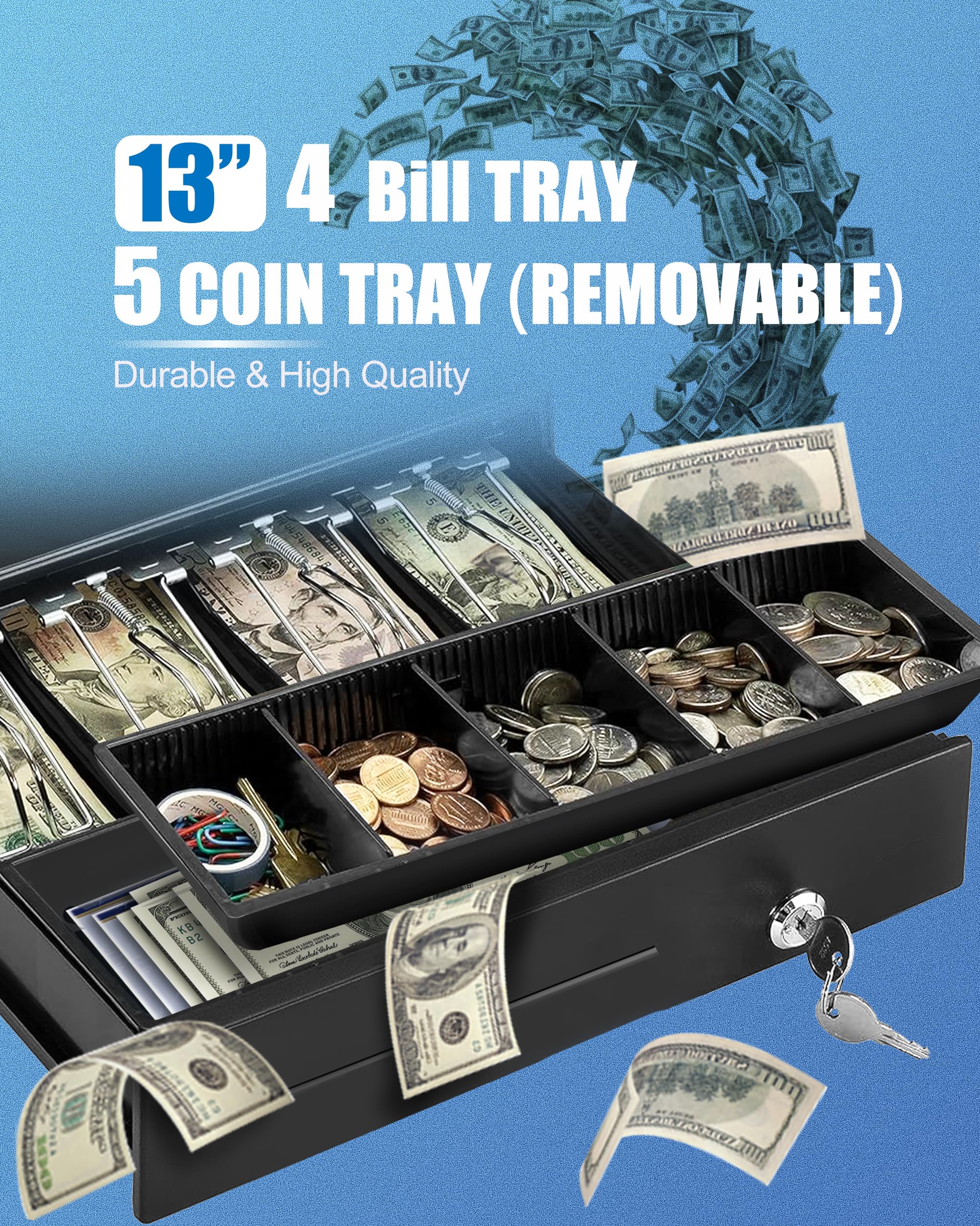 ๐ฅใ๐๐๐ฌ๐ก ๐๐ซ๐๐ฐ๐๐ซ& ๐๐ฎ๐ข๐ฅ๐ญ-๐๐ง ๐๐๐๐๐ข๐ฉ๐ญ ๐๐ซ๐ข๐ง๐ญ๐๐ซใ: Perfiware cash register for small businesses equips with a High Quality cash drawer(4 BILL SLOTS| 5 COIN SLOTS) and a built-in receipt printer(come with printer paper for test), which can greatly enhance your business!