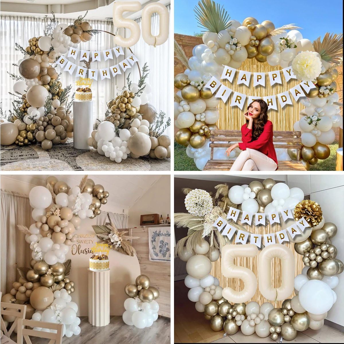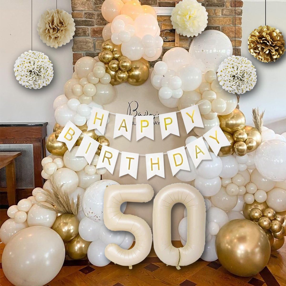 50th Decorations for Women Men: You can assemble the alphabet of the birthday decoration very easily and string these flags together yourself. White and gold party decorations can be reused on many occasions. The color is perfect for men womens 50th beige gold party birthday party decoration set, and happy birthday cake topper, happy birthday banner, all-in-one kit is perfect for creating an elegant and dreamy 50 and fabulous birthday party