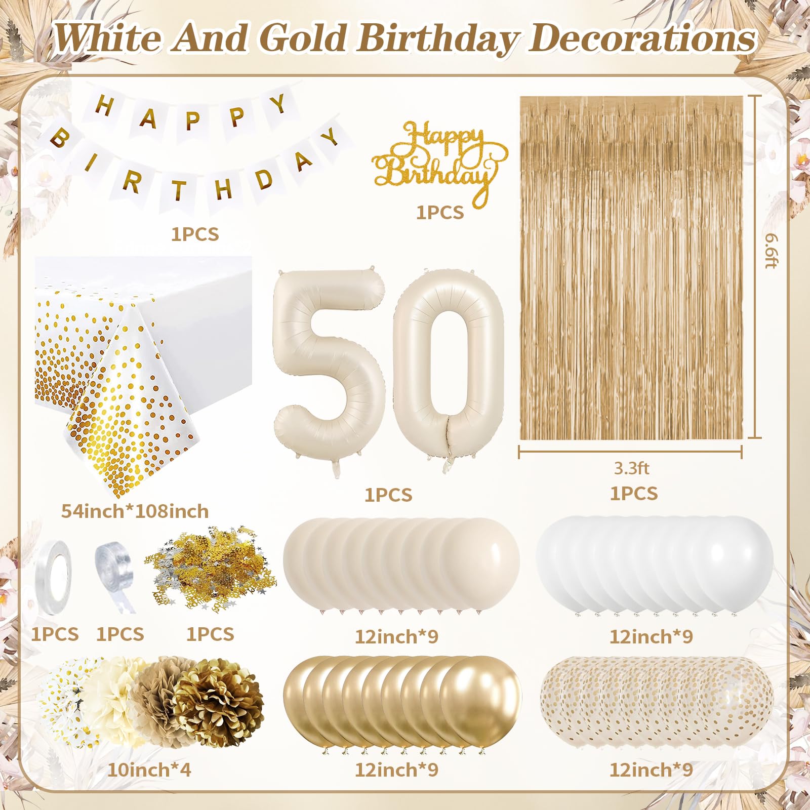 50th Birthday Decorations for Her: The package contains 9 x sand white balloons, 9 x white balloons, 9 x gold metallic balloons, 9 x dot balloons, 4 x paper pompom flowers, 1X white sand 50 balloon number, 1 x gold happy birthday banner, 1 x white gold tablecloth, 1 x gold rain curtain - 1 x 1 x 2 m, 10g white gold confetti, 1 cake topper, 1 x Ribbon