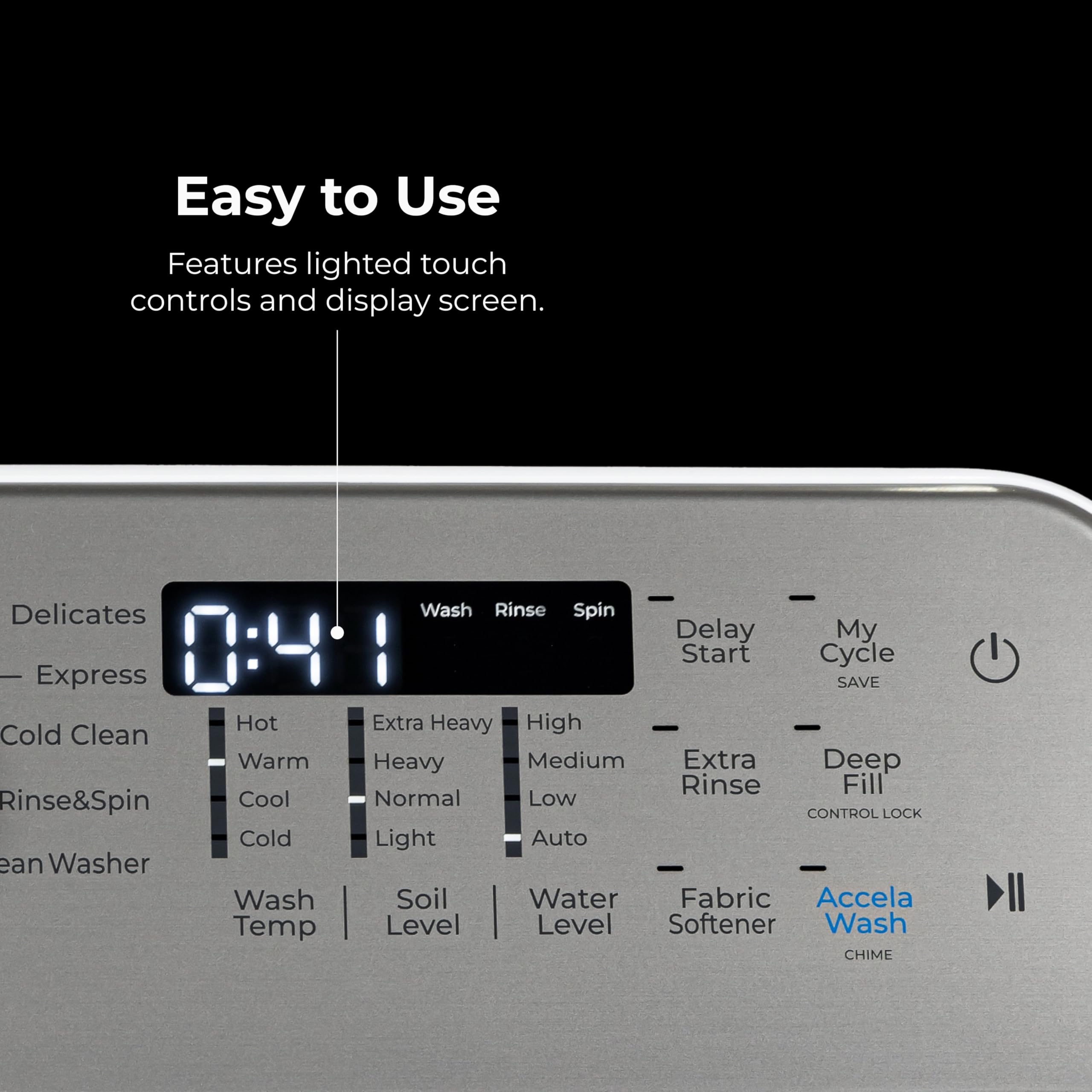 More Laundry, Less Time: Our high-efficiency top load washer features Express Wash to clean small loads in just 30 minutes (based on a 3-lb load, default cycle setting), and Accela Wash to clean full-size loads up to 51% faster (compared to a standard 8-lb load, normal cycle, warm wash temp, extra heavy soil setting) - so you spend less time doing laundry