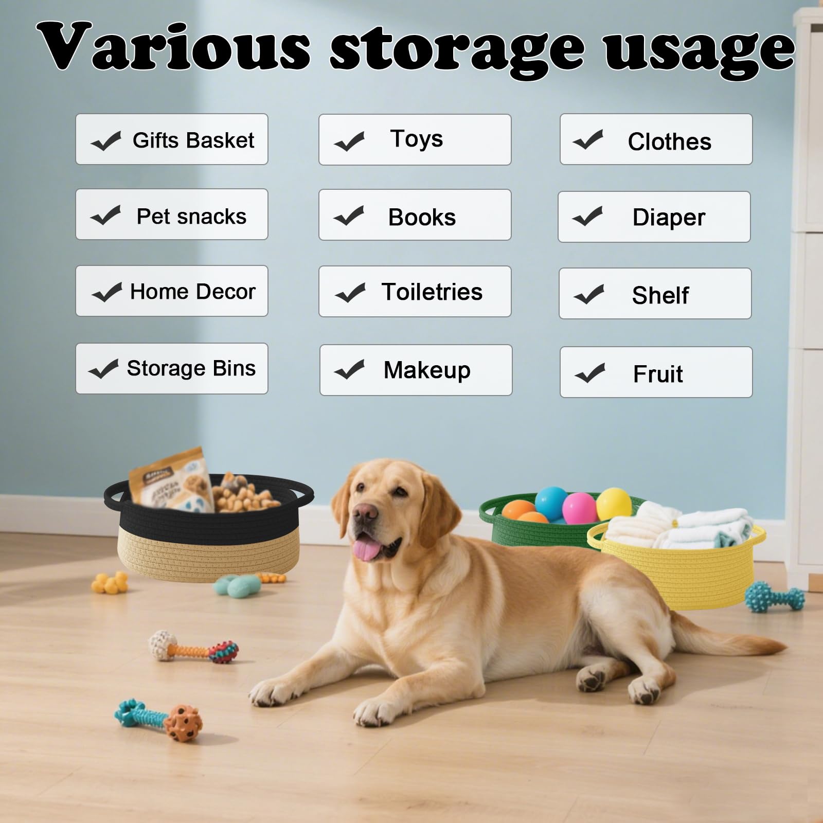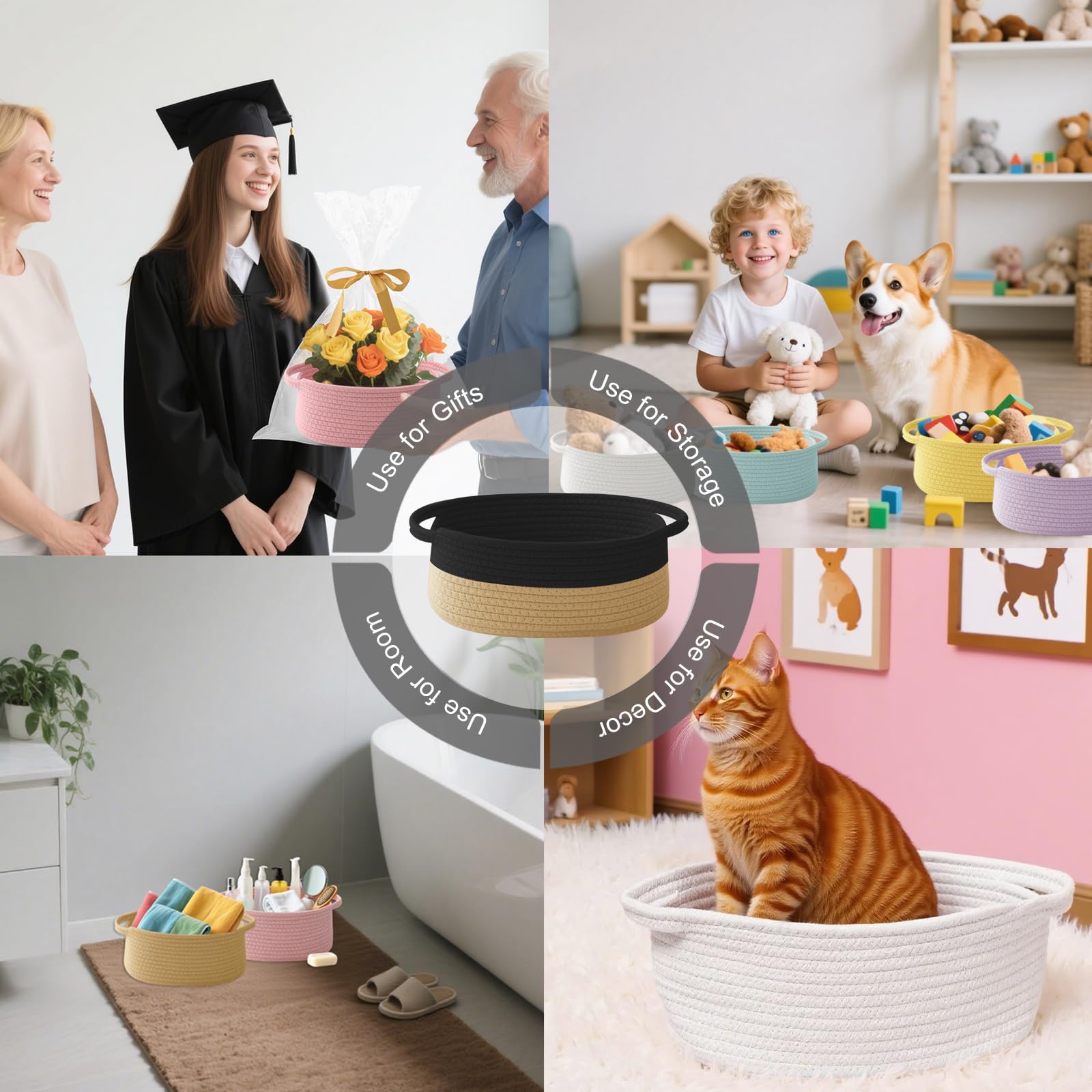 【Multi-Purpose Storage】Woven baskets for storage,bathroom organization, shelf styling,storage basket for organizing snacks, dog cat, magazine, shoes, remotes, books, towels, toiletries, keys and more.Widely used in living room,bedrooms,bathrooms,kids room,and Kitchen