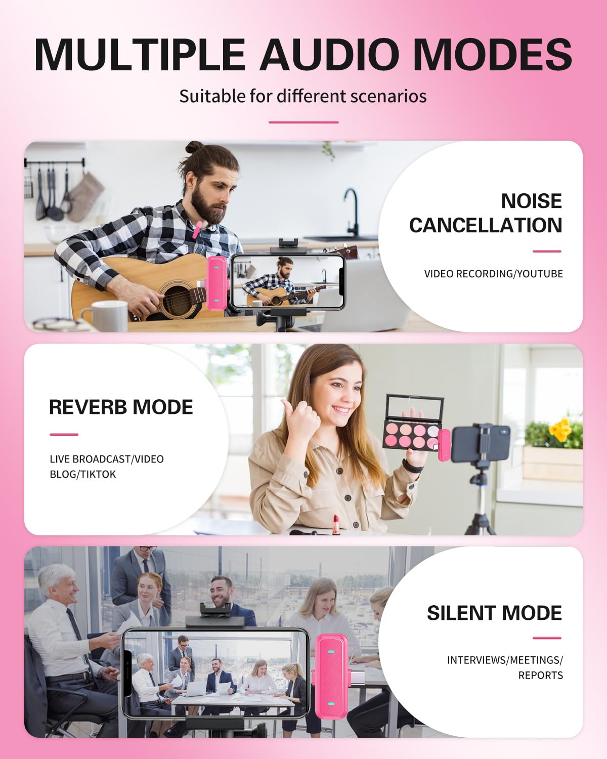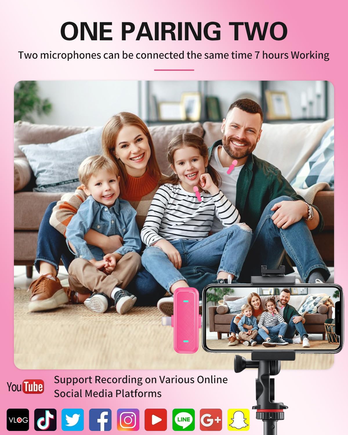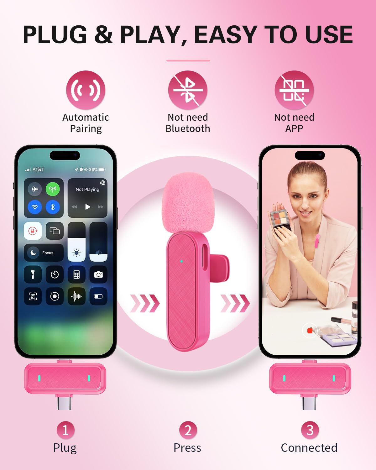 【Easy and automatic connection】- This Bluetooth wireless mic is very simple to set up. No adapters, Bluetooth or applications are required. Just plug the receiver into your iPhone/iPad or Android device and turn on the microphone power, they will automatically connect and pick up the sound. Easily pick up the sound of YouTube, videos, live broadcasts, podcasts, blogs, Vlogs, Zoom, interviews, online meetings, online education, Tik Tok, singing and more.