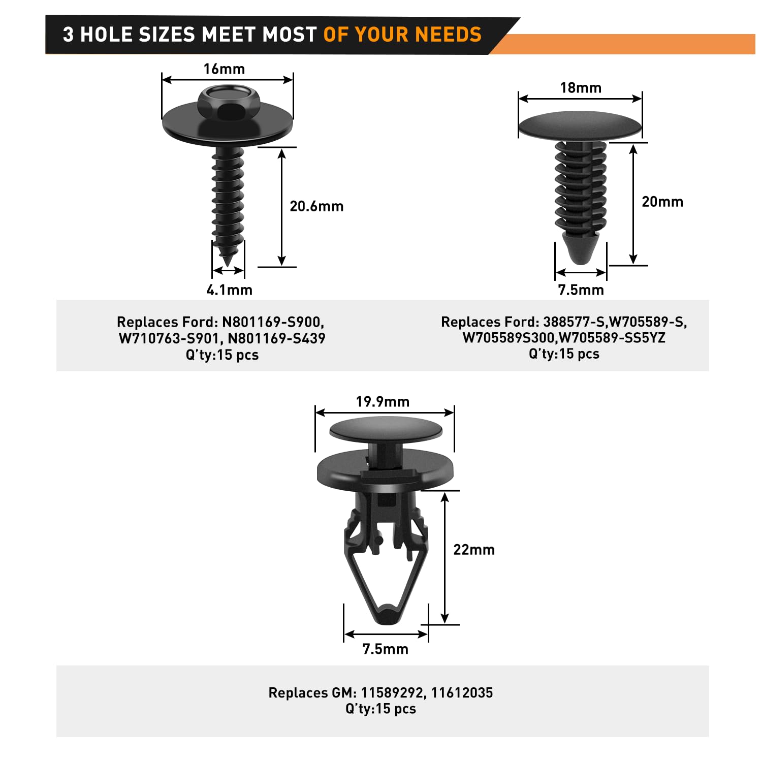 【OEM Quality】- Made of high-quality nylon material and Zinc Plated Steel, these retainer clips are a perfect replacement for Ford: 388577-S,W705589-S,W705589S300,W705589-SS5YZ; Ford: N801169-S900, W710763-S901, N801169-S439; GM: 11589292, 11612035