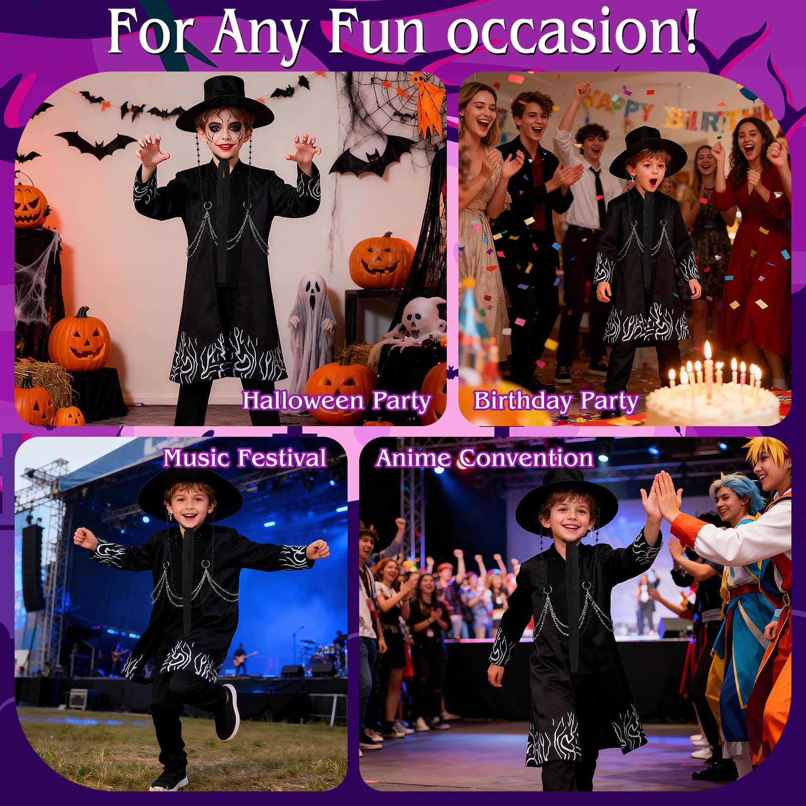 Description Complete Black Cosplay Costume Set with Coat & Accessories, Halloween Anime Inspired Outfit Includes Pants, Hat for Theme Parties Material: Polyester Please check the following size details carefully before you place order. Black Size Chart: 110: Bust: 67cm; Waist: 45cm; Coat Length: 82cm; Pants Length: 63cm; Recommended Height: 110cm; 120: Bust: 72cm; Waist: 49cm; Coat Length: 86cm; Pants Length: 69cm; Recommended Height: 120cm; 130: Bust: 75cm; Waist: 53cm; Coat Length: 90cm; Pants Length: 75cm; Recommended Height: 130cm; 140: Bust: 82cm; Waist: 57cm; Coat Length: 94cm; Pants Length: 81cm; Recommended Height: 140cm; 150: Bust: 87cm; Waist: 61cm; Coat Length: 98cm; Pants Length: 87cm; Recommended Height: 150cm; Notice: 1: Please keep away from kids under 3 years, play under adult's supervision 2: Please get away from fire