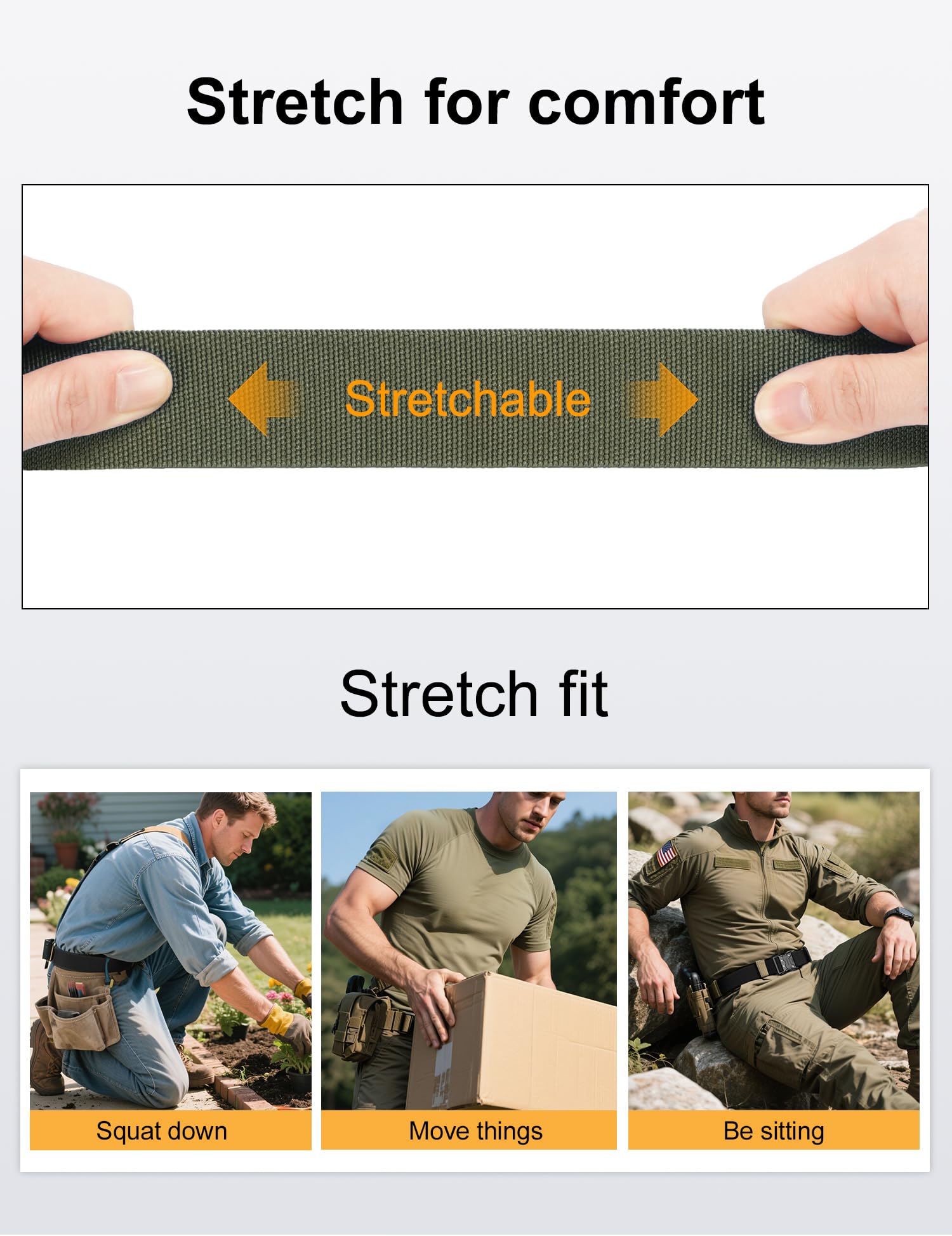 HIGH QULITY STRETCH NYLON:We intent to make the strap be stretch. The strap is made by special stretch material which is more solid than regular belt. More than that, it is very sturdy as well as stretch, which make your waist be more comfortable as well as stay tight, when you take large range of activities. Anyone who do physical activities for a long period of hours will get a great use out of the tactical belt