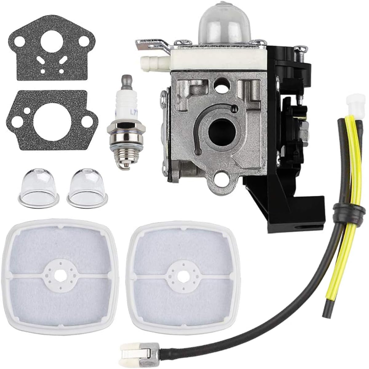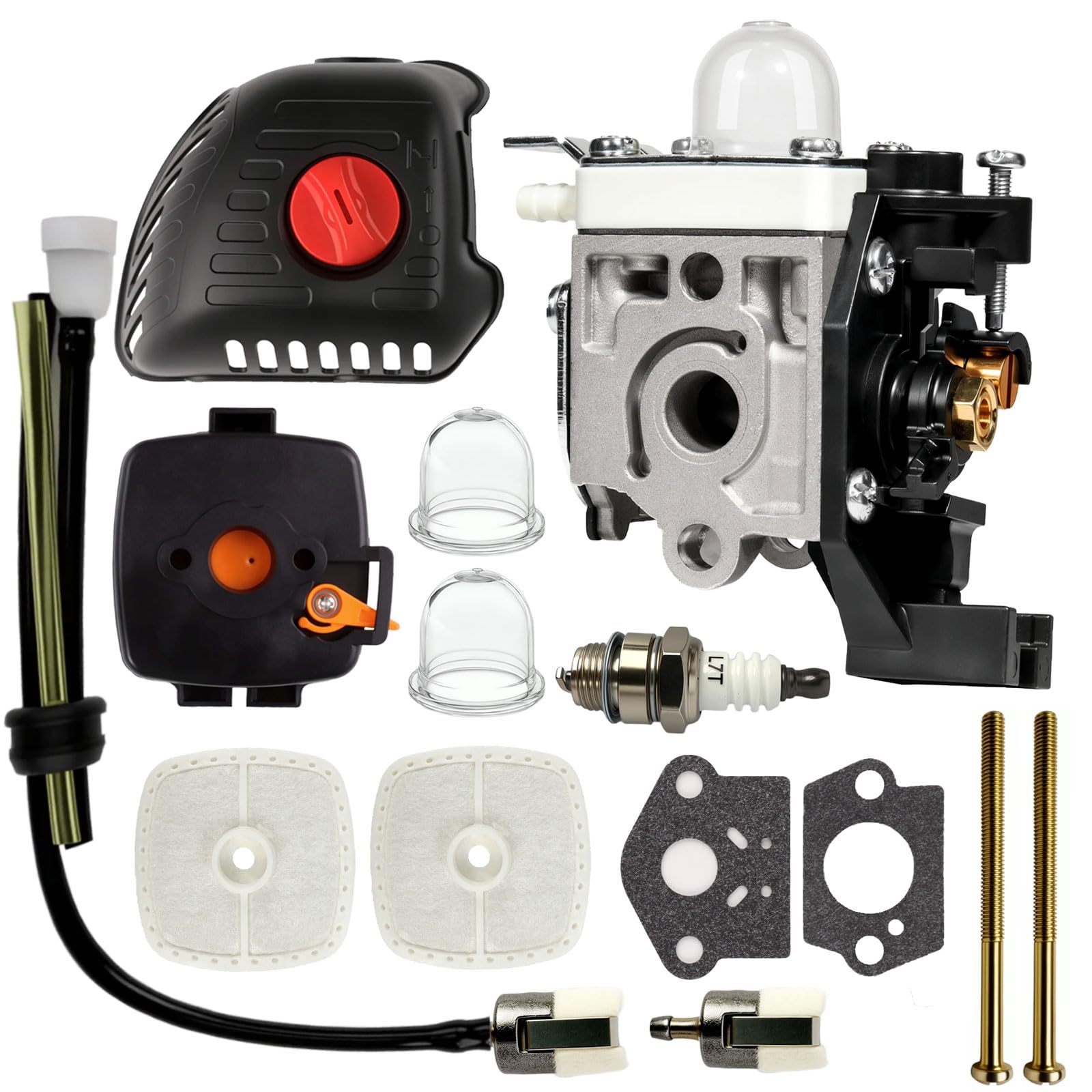 Package include: 1 srm225 carburetor, 1 srm225 air filter cover, 1 srm225 air cleaner case,2 air filter, 1 spark plug,2 primer bulb,2 mounting gasket,1 fuel line kit,1 fuel filter, 2 screws