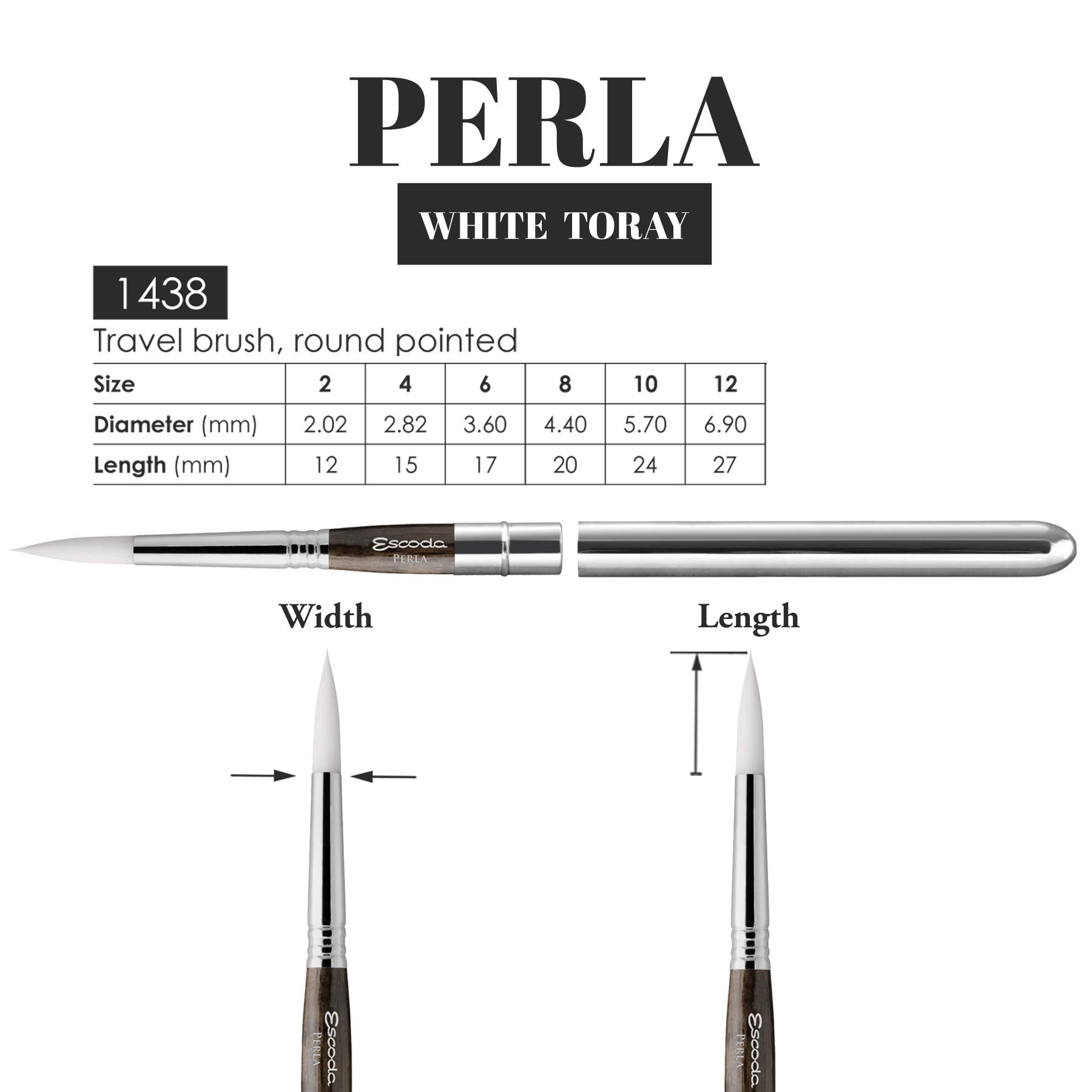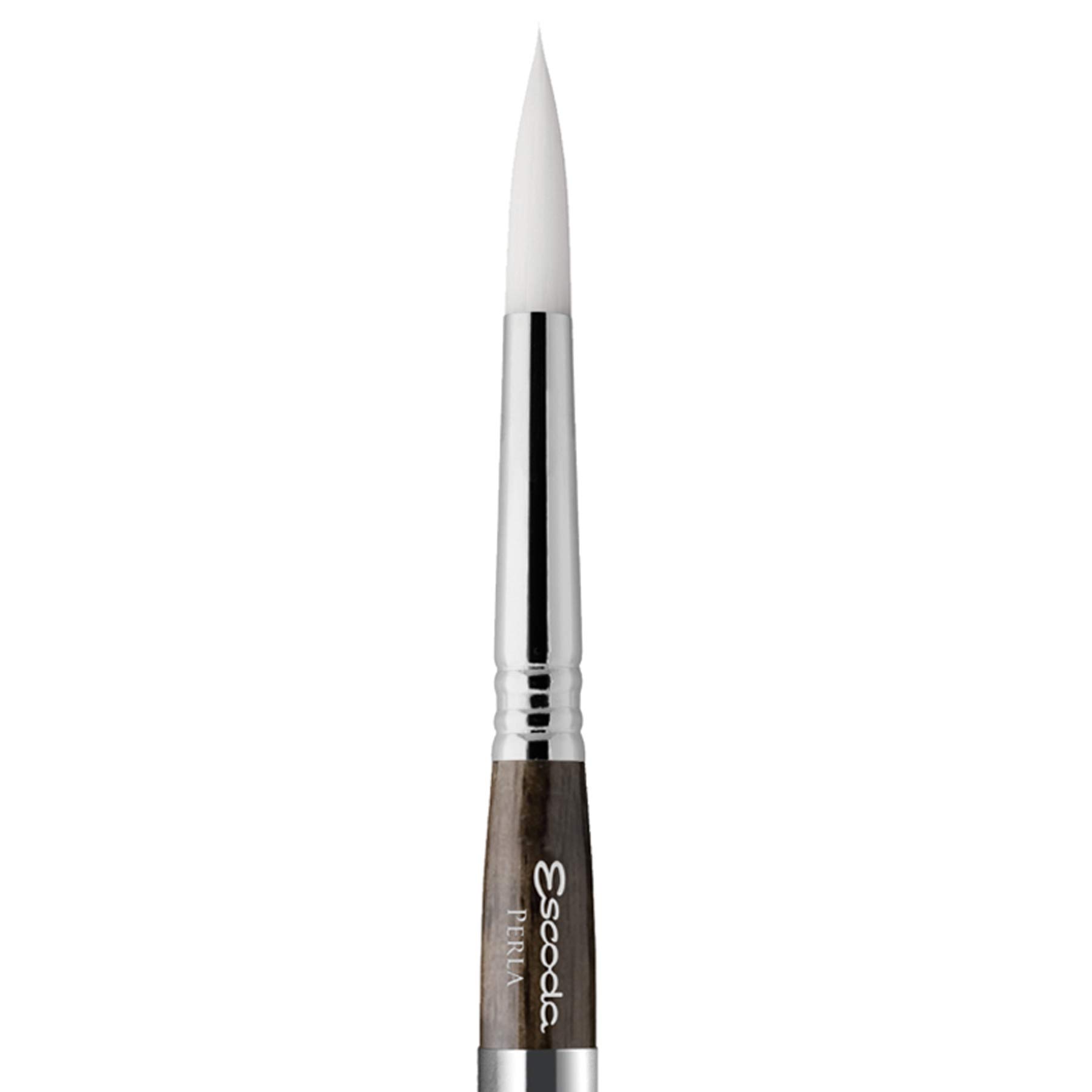 The Escoda Series 1438 Perla Travel Brushes are made from a custom blend of distinctively patterned synthetic fibers containing all the attributes of natural sable hair. A perfect choice for the professional or seasoned watercolor artist, this brush retains its perfect point after much use and has top notch color retention & spring. Escoda brushes continue to be made by hand by the Escoda family as they were since 1933. This is a size 8 pointed round brush with a silver bristles measuring 4. 4mm and 22mm in diameter and has brush extender handle that also acts as a cap to covers the bristles for transport.