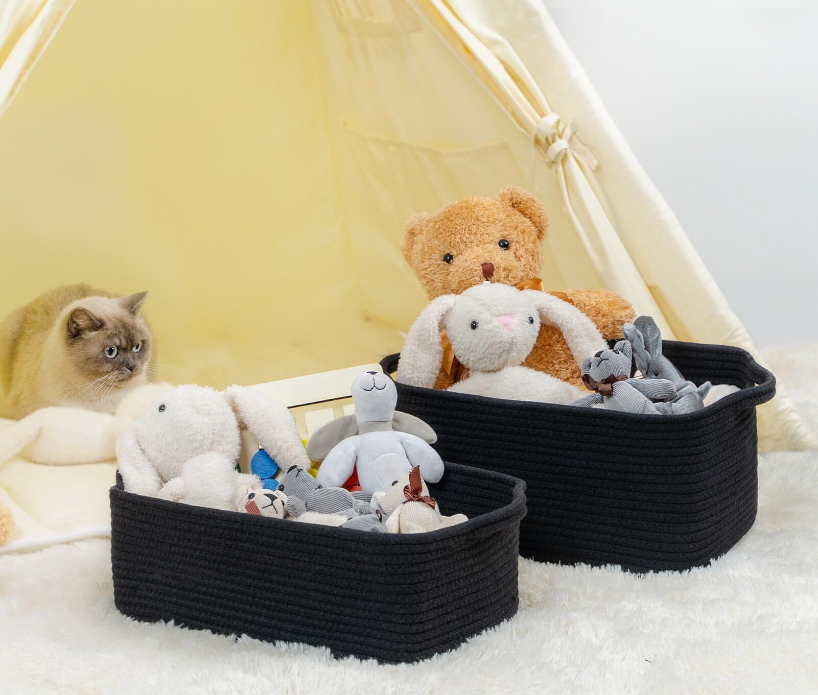 Rectangular Basket. The size of woven rope basket is 14 x 10 x 5Inches. Great storage solutions for your laundry room, closet, shelves, entryway, playroom and so on. It also can be used for nursery room as baby baskets or small toy baskets, making your home clean and tidy