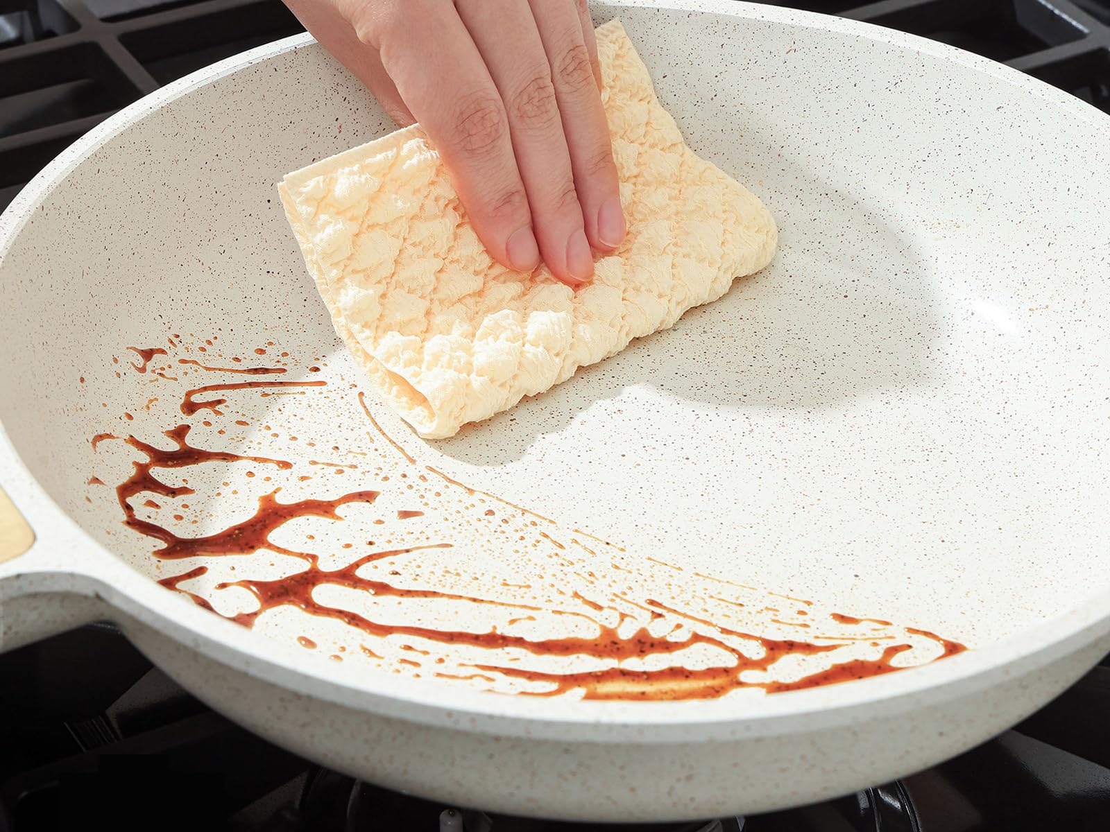 EASE OF CLEANING - No one loves to do extra dishes. Its slippery, nonstick surface and no rivets design make these pots and pans easy to clean in seconds with a towel, soap and warm water. Recommend Hand Washing to extend the life of pans.