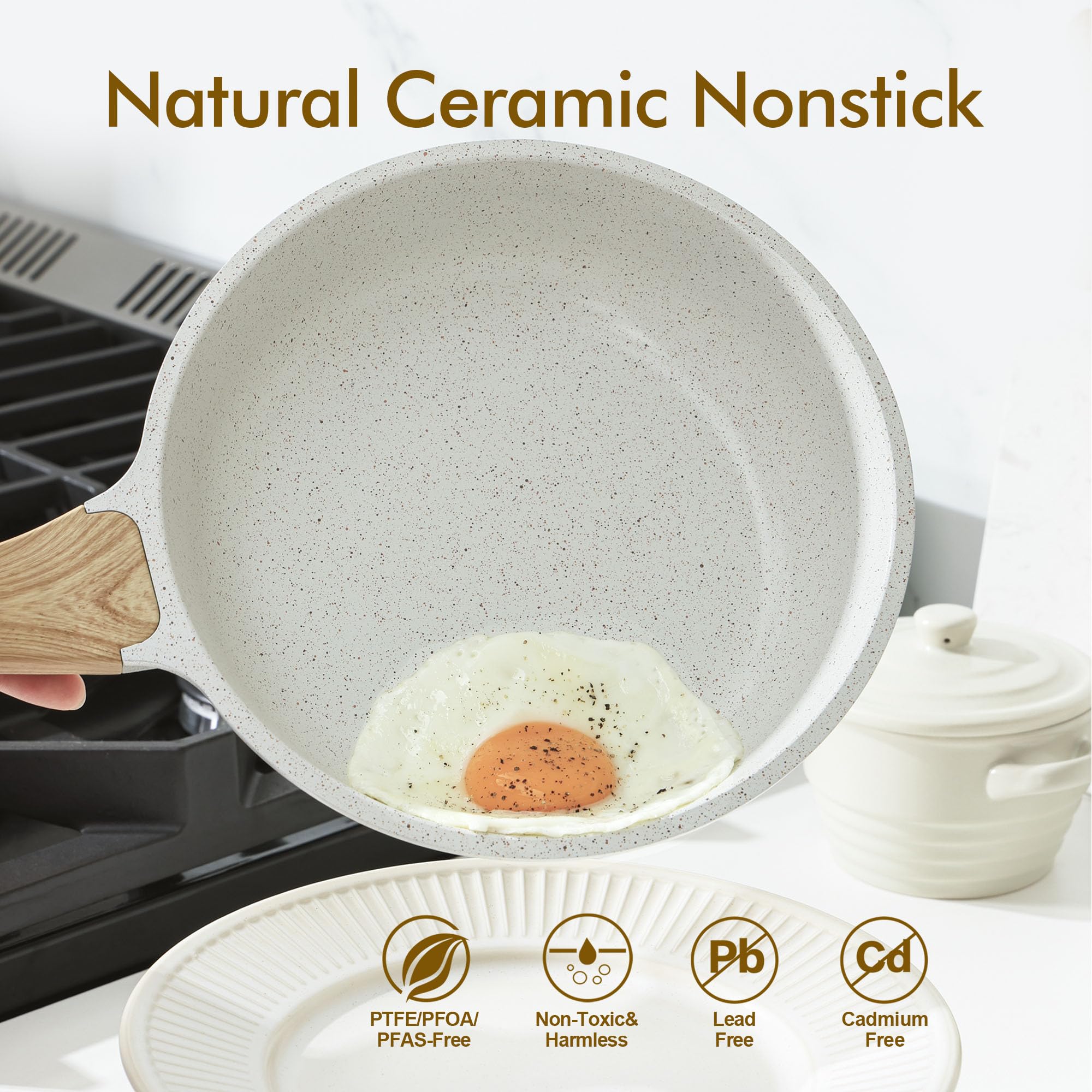HEALTHY CERAMIC SKILLET - Made of natural ceramic, free of PFOA, PTFE, PFAS, lead and cadmium, safe and healthy. No toxic substances will be produced even overheated. No coating to come off into your food.