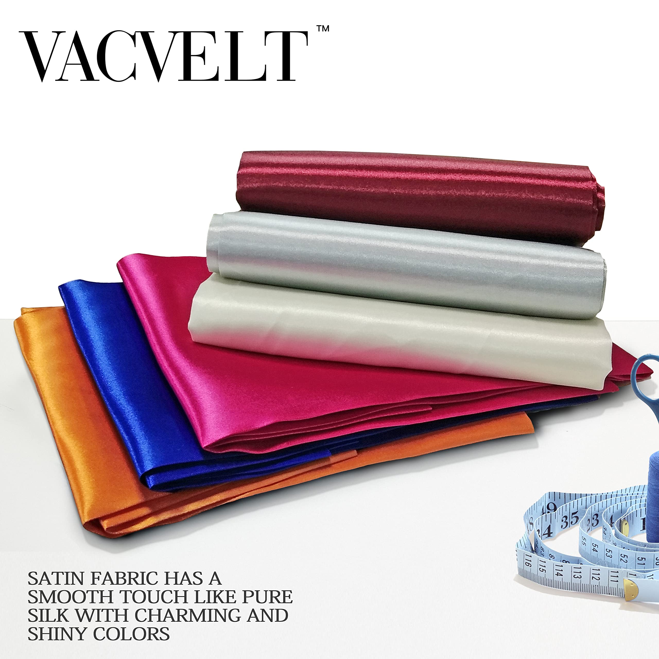 VACVELT Charmeuse Satin Fabric by The Yard --Luxury satin fabric are made of high-quality 100 percent Polyester (Satin), soft and breathable, charming and shiny. --Cheap and cheerful, provide you with luxury experience and enjoy your DIY time. Product Specification: Material: Satin Size: 1 Yard Satin Fabric Size: 36 x 60 Inch (L*W) 5 Yards Satin Fabric Size: 180 x 60 Inch (L*W) 10 Yards Satin Fabric Size: 360 x 60 Inch (L*W) Available Color (Solid Color): Burgundy, Hot Pink, Pink, Lavender, Purple, Royal Blue, Baby Blue, Gold, Hunter Green, Ivory White, Orange, Silver Grey, Rose Gold, Black Washing Suggestions: Can be washed by hand or machine, please do not bleach Tips: All the pictures of our products are taken in an environment with sufficient light. Because the satin fabric is glossy, the color will vary slightly under different light intensities. Please do not mind. About Us VACVELT supports refunds for 30 days without any reason. If you are not satisfied with our products, please feel free to contact us, and we will be happy to help you. We attach great importance to the shopping experience of our customers. If you have any questions or suggestions for improvement of our products, please send us an email directly.