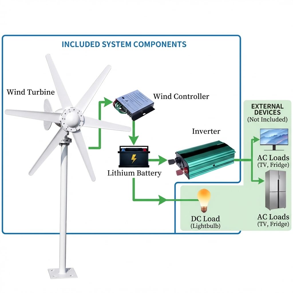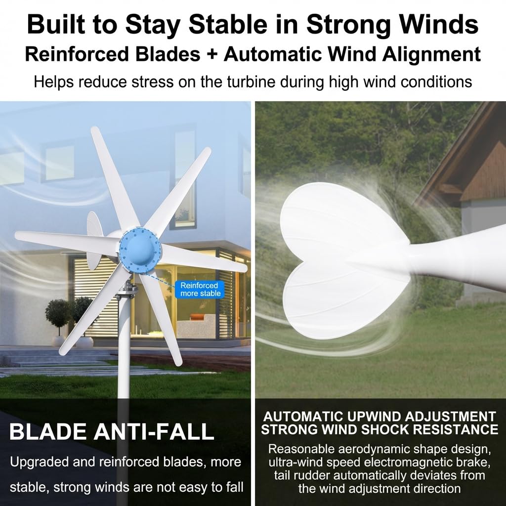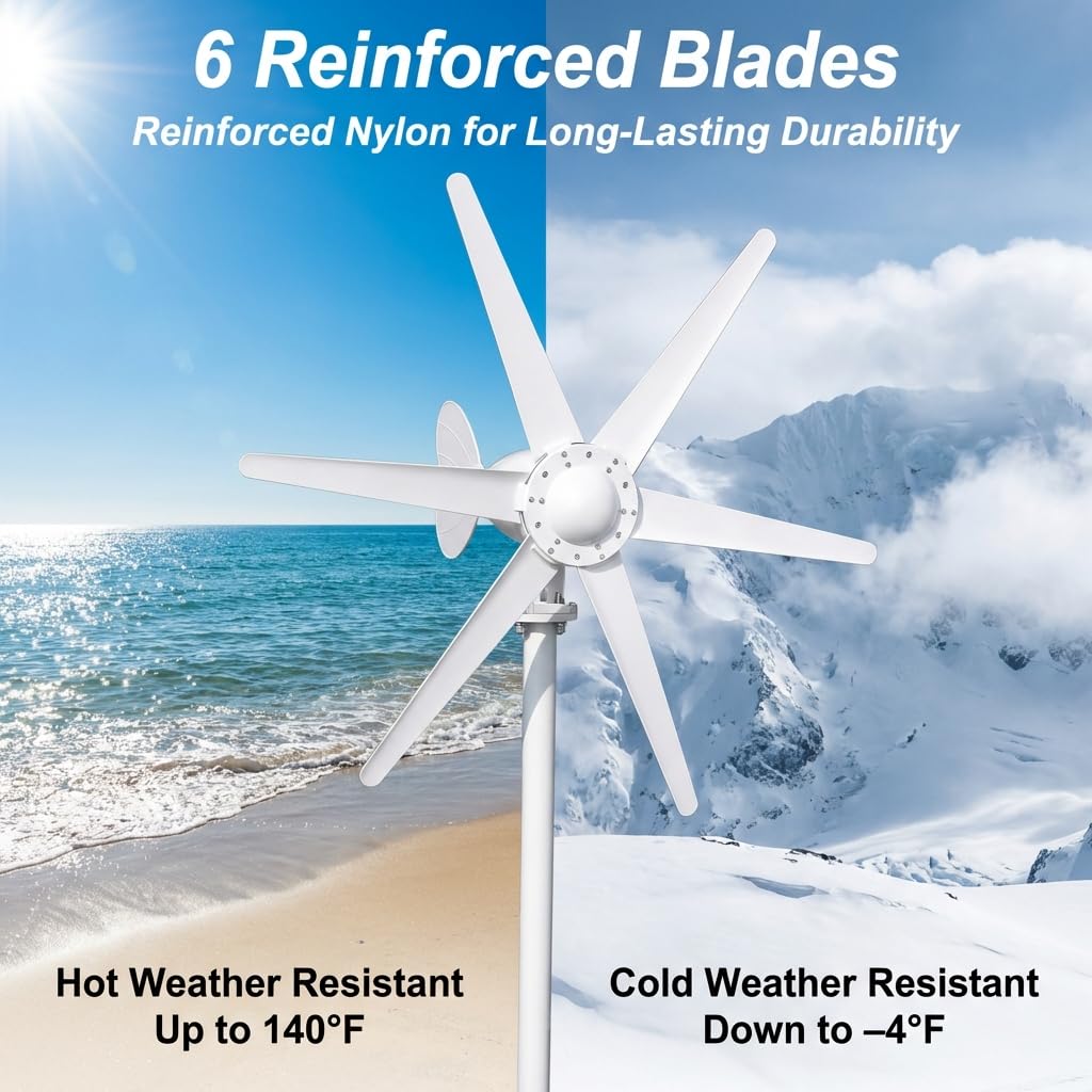 Quiet & Smooth Operation for Residential Use: Equipped with a three-phase AC disk generator and dual precision bearings, this wind turbine operates with low vibration and reduced mechanical noise. The optimized 6-blade aerodynamic design ensures stable rotation and quiet performance, making it suitable for home environments.