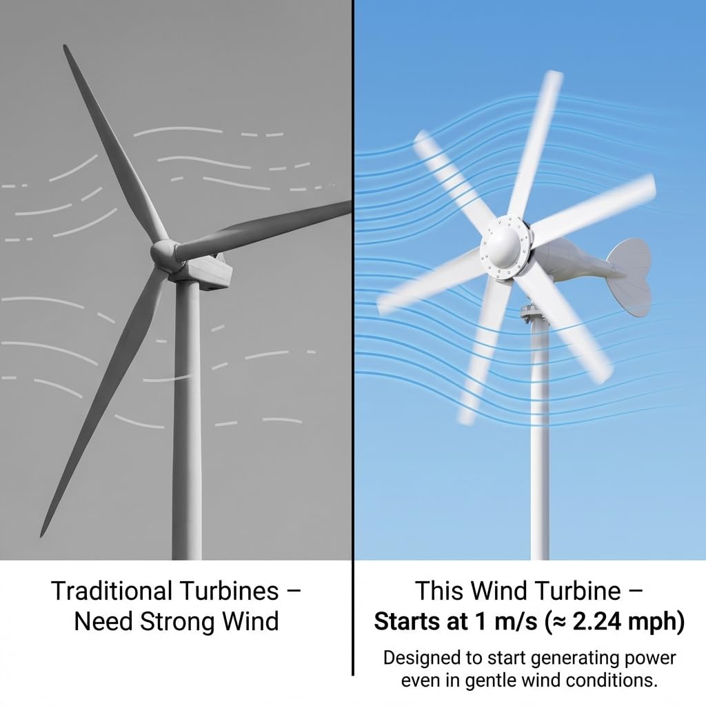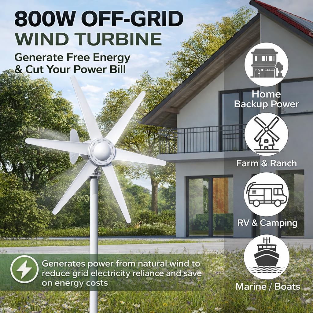 Excellent Performance Even in Low Wind Areas: Designed with a low 1.0m/s start-up wind speed, this 800W wind turbine begins generating power earlier than many standard models. Ideal for moderate and low-wind regions such as residential areas, farms, cabins, RV setups, and boats, ensuring more consistent energy capture throughout the day.