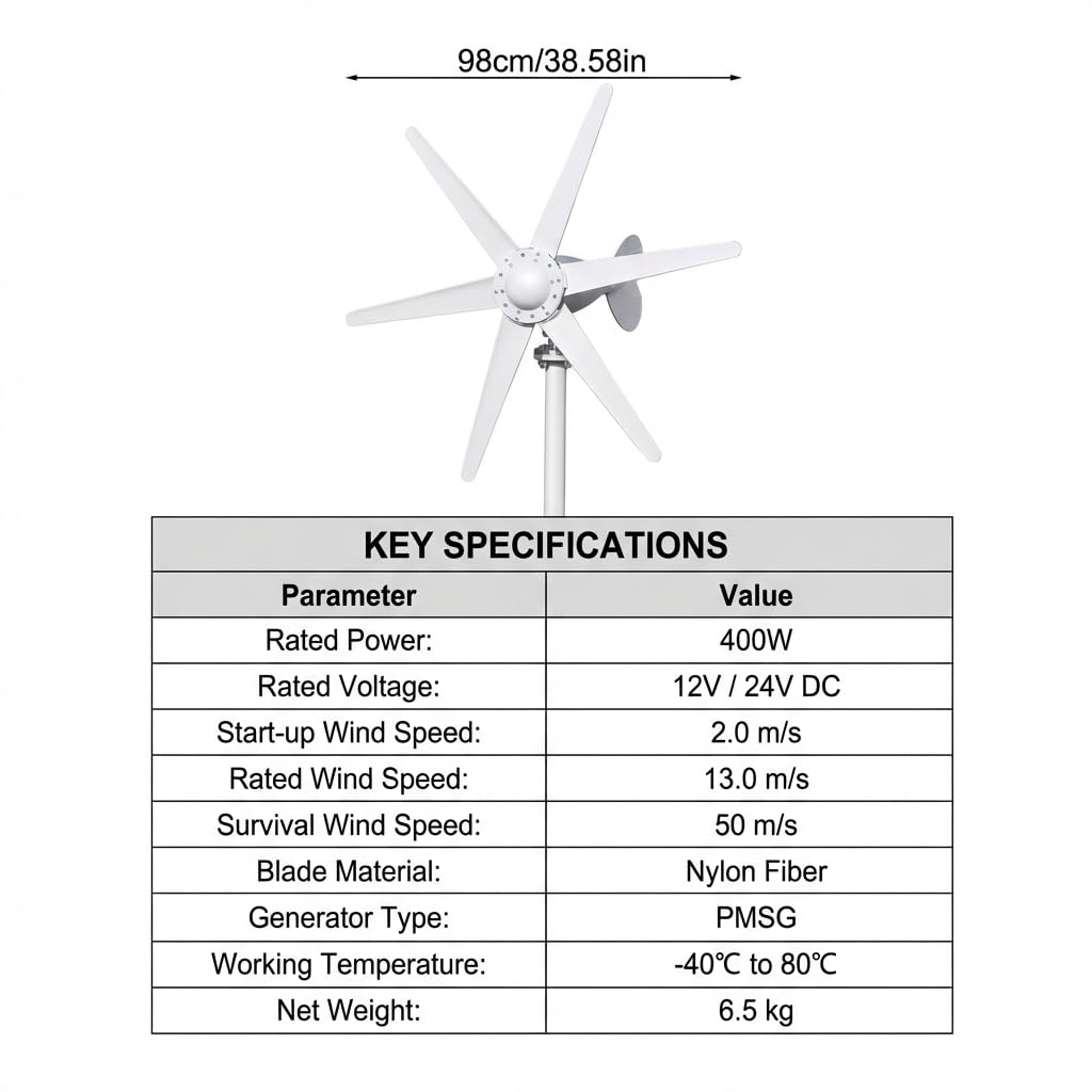 Item Description: Home Power Support When installed in a yard or farm area, the wind turbine generator supplies off grid power, offering peace of mind compared with reliance on traditional grid dependent systems. Low Wind Operation During daily use in areas with variable airflow, the low start wind speed allows earlier operation, giving confidence compared with older wind turbines that require stronger wind. Six Blade Rotation Design In open outdoor scenarios, the six blade structure improves rotational stability, providing relief compared with fewer blade turbine designs. Three Phase AC Generator For consistent power generation, the three phase disk generator supports stable output, offering confidence compared with single phase generator structures. Built In Controller Function While operating in home or RV environments, the built in controller manages wind levels and braking, giving peace of mind compared with manual control setups. Item Name: Wind Turbines Material: Plastic Rated Power: 800W Rated Voltage: 12V/24V Starting Wind Speed: 1.0m/s Rated Wind Speed: 11m/s Safe Wind Speed: 32m/s Wind Wheel Diameter: 1.0/1.1m Number of Blades: 6 pieces Blade Material: High Strength Nylon Composite Material Generator Type: Three-Phase Alternating Current Disk Generator Built-in Controller: 2.5-7 Levels of Wind, Standard 2A Current Charging, Full Power Protection, Brake Power Off and Lightning Protection Function Fuselage Length: 7.6cm Wind Direction Adjustment: Automatic Adjustment To Windward Operating Temperature: -20-60 Degrees Celsius Size Details: L: 105cm/41.34", W: 65cm/25.59" (Approx.) Package Includes: 1 x Wind Turbines1 x Controller6 x Blades1 x Tool Kit1 x User English Manual
