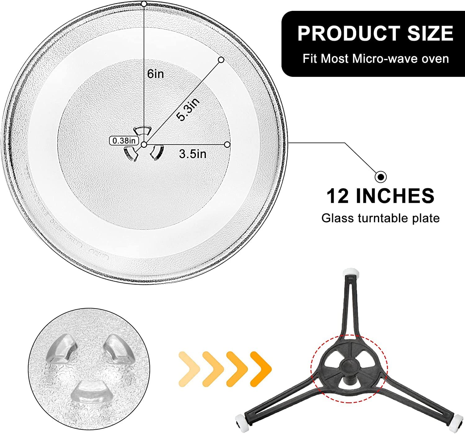 [Ensuring Proper Fit]Check your bushing coupler (the center piece that rotates the plate) & make sure it has three notches-these notches should be aligned with the middle of the plate. Measure the microwave interior to ensure that it will fit the 12 in glass microwave plate