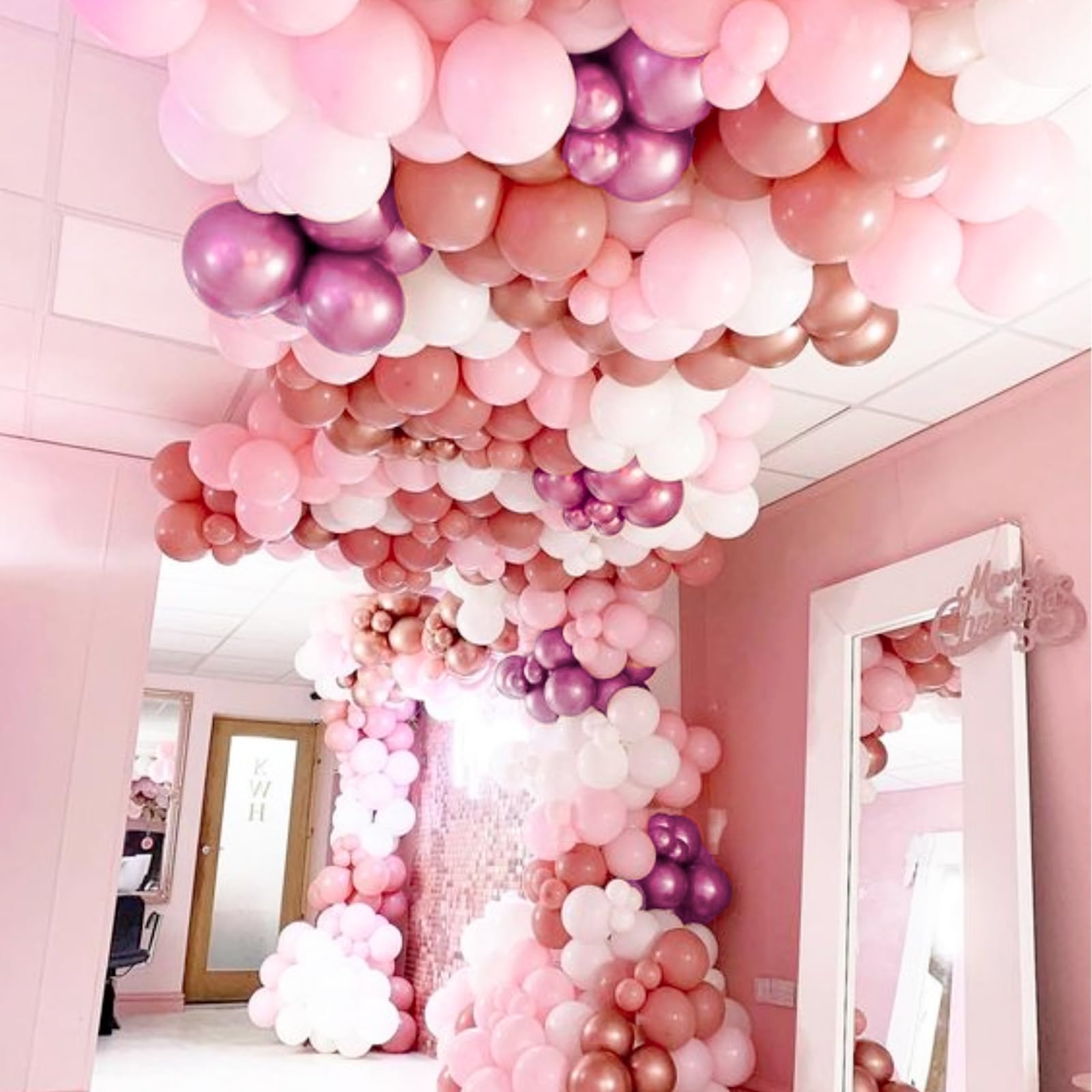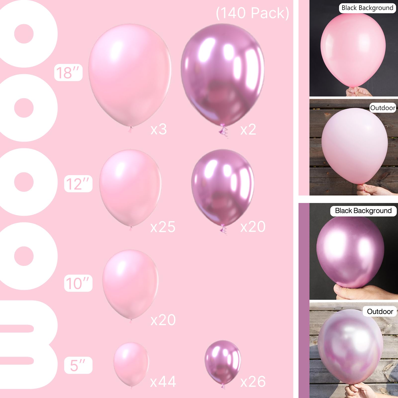 140 pcs PINK BALLOONS DIFFERENT SIZES: Package includes 18 inch balloons 5 pcs, 12 inch balloons 45 pcs, 10 inch balloons 20 pcs, 5 inch small balloons 70 pcs, balloon decorating strip included