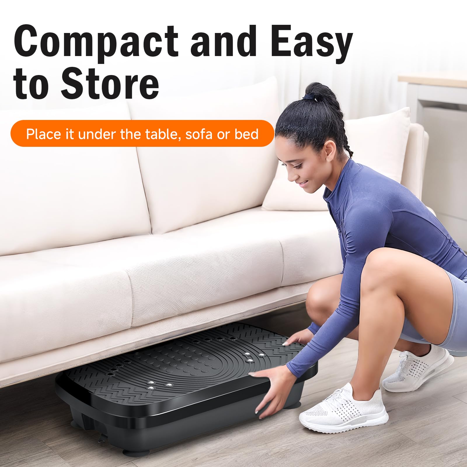 Versatile and Convenient Design: The vibration platform machines offers adjustable amplitude and frequency (1-240), with P1-P10 auto modes and HR manual mode to meet your various needs. Combined with 2 resistance bands and vibration function, it provides a full-body workout. The LED backlit display and smart remote control make operation simple and intuitive, while the compact design makes it easy to store and carry, taking up less space and suitable for various scenarios in the home and office.