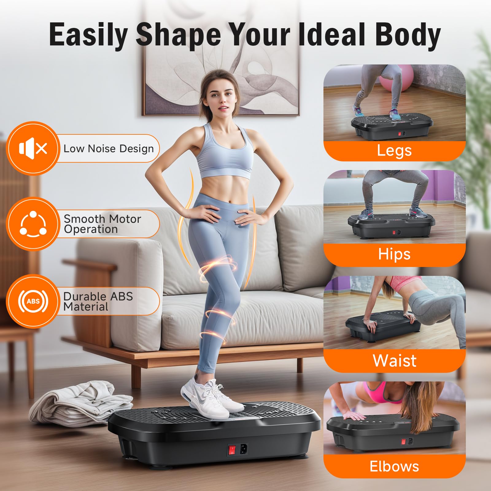 Rapid Fat Burning and Body Shaping: Unleash your body's potential with our vibration plate. Powered by a powerful 200W motor, it easily helps you achieve your ideal physique. High-frequency vibration technology stimulates deep muscles, promoting additional contractions and rapidly burning calories and fat. This workout is more efficient than traditional equipment that relies on resistance or gravity. Just 10 minutes a day can help you quickly achieve your fat loss goals.