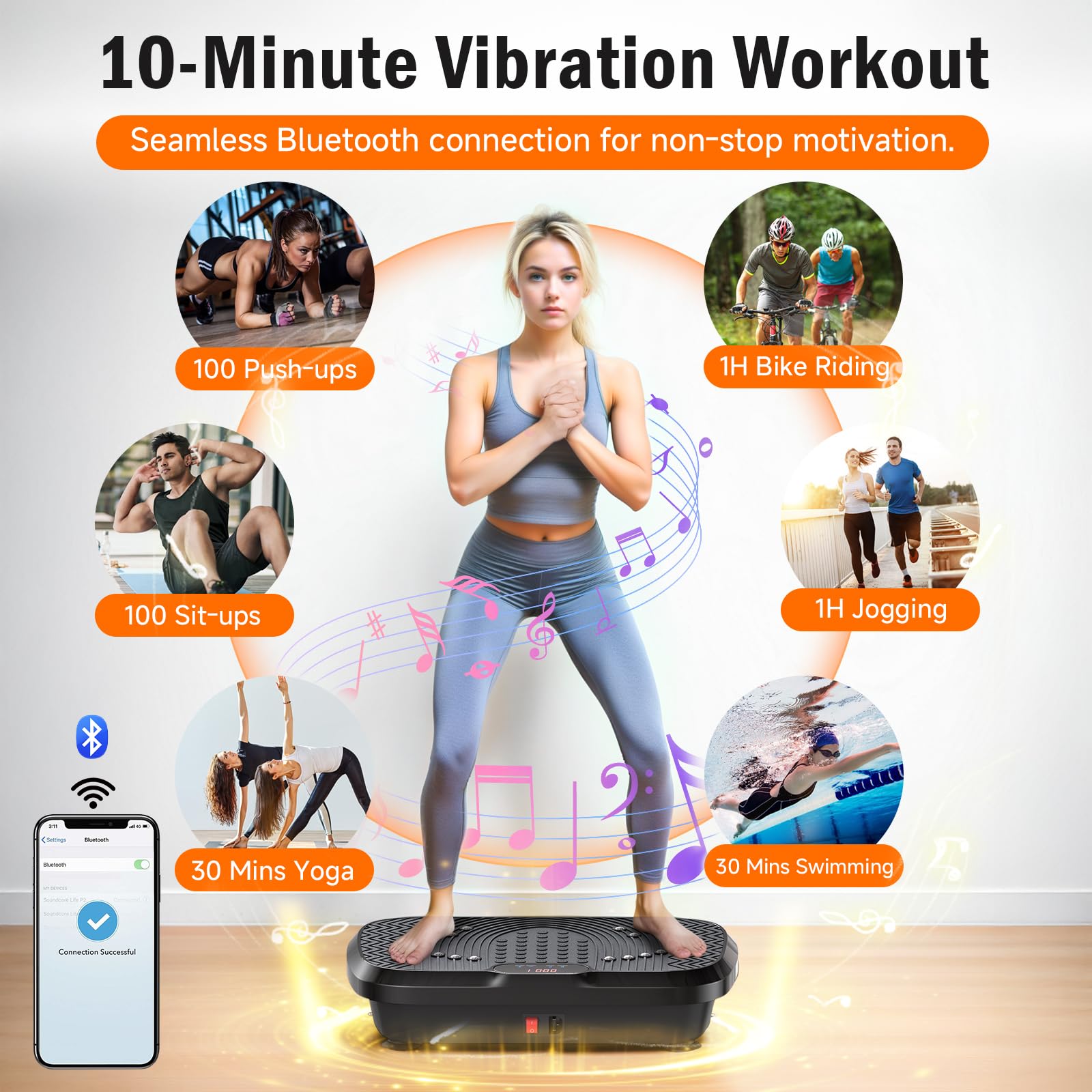 Superior Quality and Durability: The vibration plate machine is made of high-load-bearing and durable ABS material, supporting a maximum weight of 330 pounds. 4 anti-slip suction cups on the bottom ensure stability during exercise and reduce vibration noise (≤60dB), allowing for safe use even in quiet home environments. Measuring 21x13x5 inches, it provides a wider workout area. Furthermore, it features Bluetooth connectivity, allowing you to connect your phone and enjoy music while exercising.