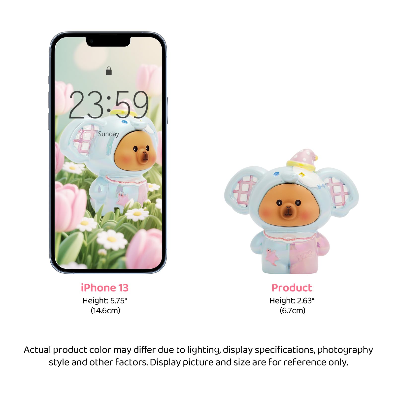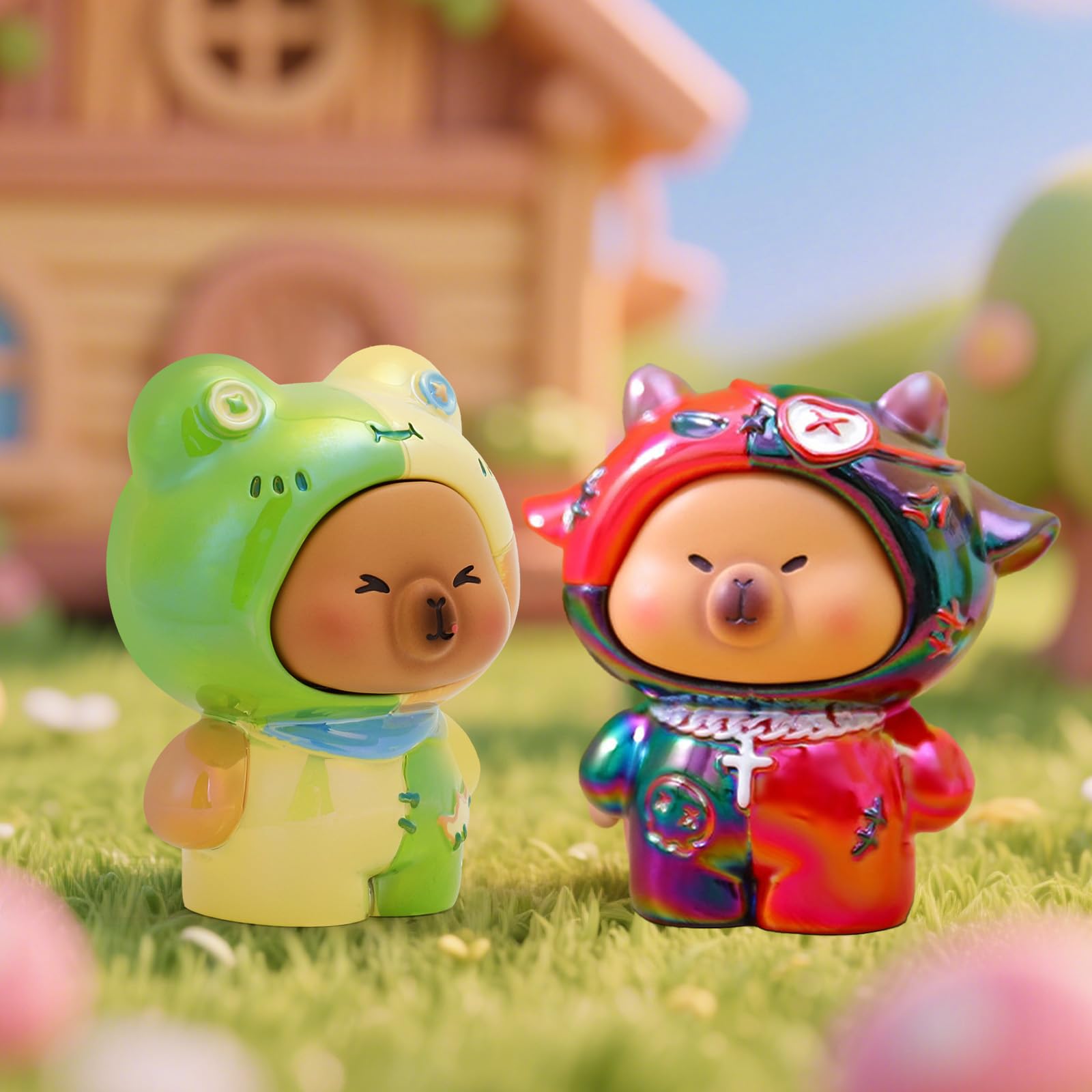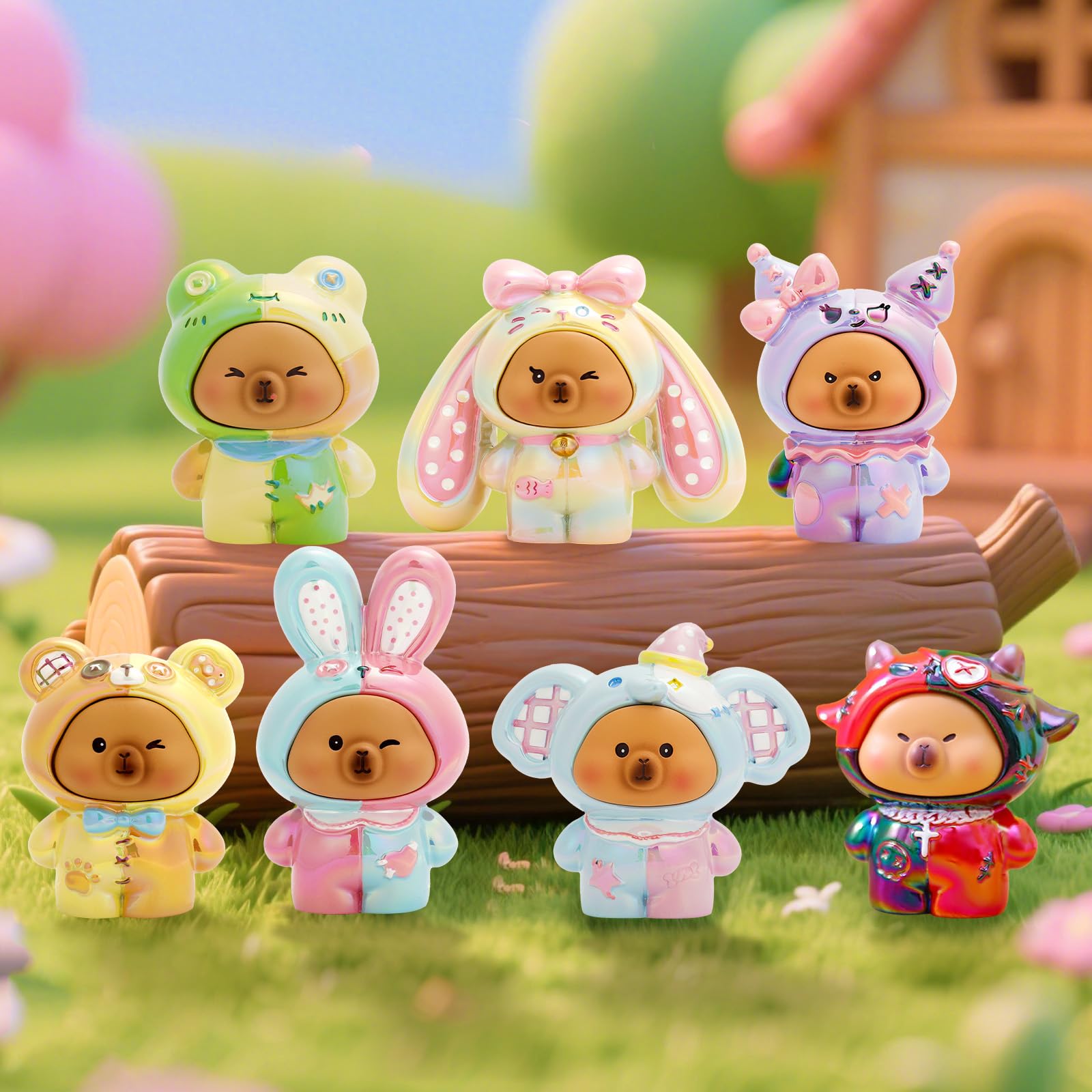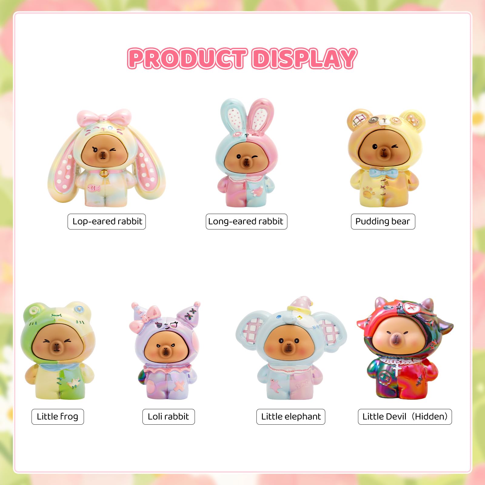 【COLLECTIBLE SERIES】: Adorable Capybara blind box figures featuring cute animal-themed designs including rabbits, frogs, bears, elephants, and cows with 6 regular designs plus 1 hidden design