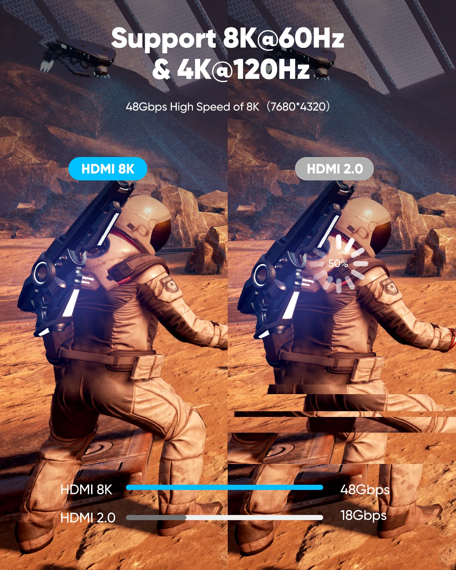 Top Technology----8K@60HZ: This 8K Ultra High Speed HDMI Cable uses the most cutting-edge technology, is compatible with 8K@60HZ and 4K@120HZ, clearly displays every particle, and accurately processes every signal source