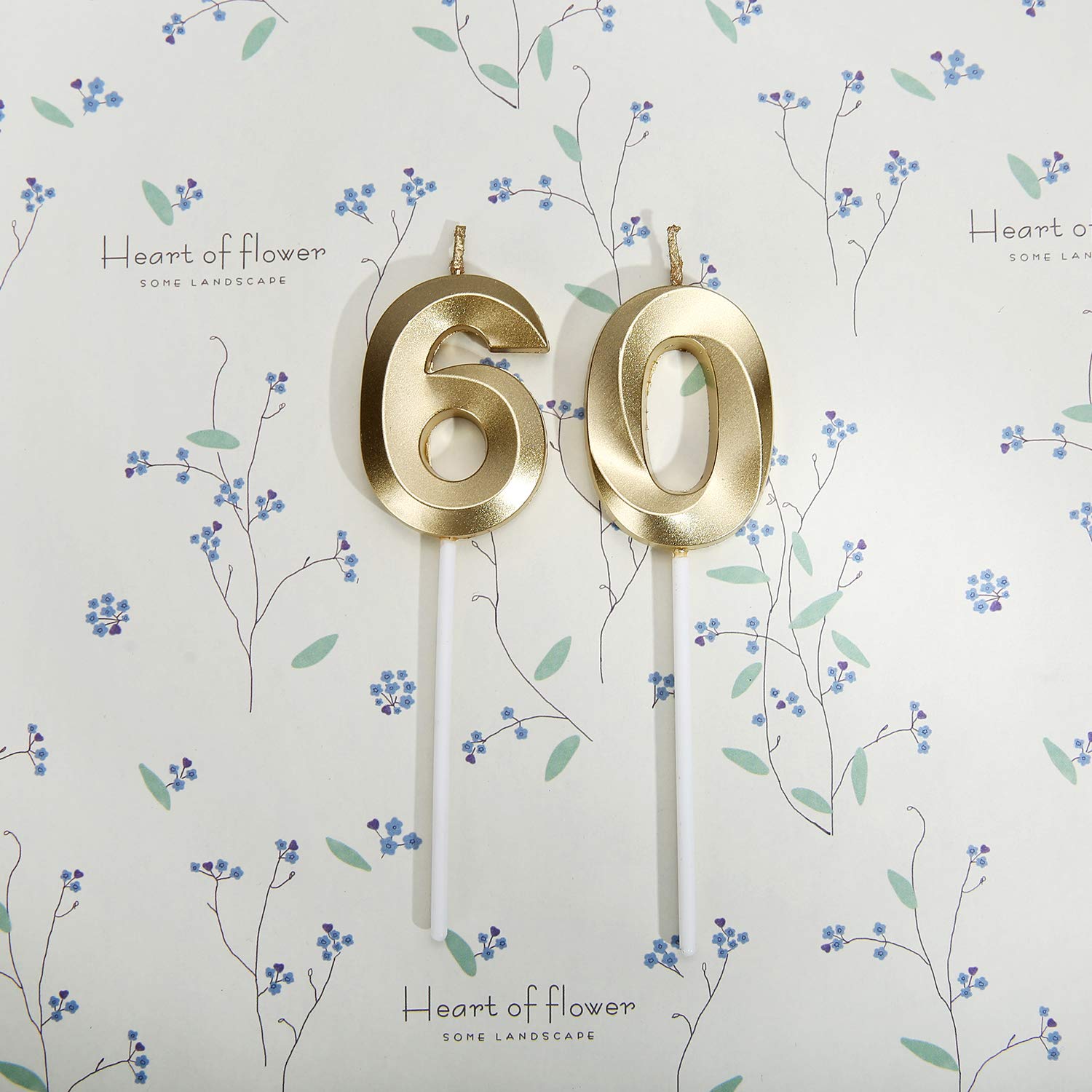 INSTRUCTIONS: Size: Width:1.3 in. Number height: 1.9 in. Total height: 4.8in Color : Glitter Gold Material : quality wax ,smokeless and non-toxic Burning Time :approx 4-5 minutes Package included:2 Pcs ,Gold Number 60 birthday candles PLEASE NOTE: Please keep the candles in shade away from the fire and make sure the size match to your birthday cakes