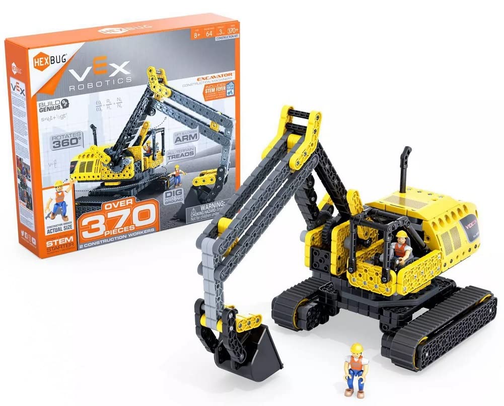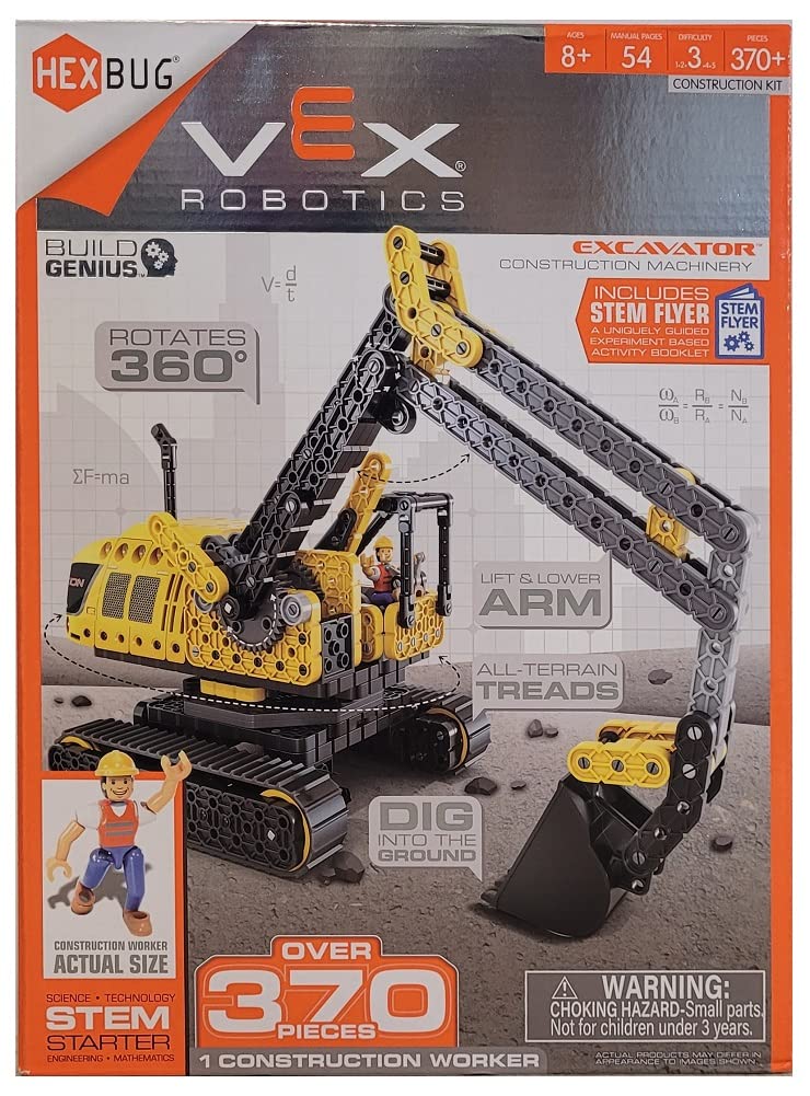 The VEX Robotics Excavator by HEXBUG is one of several new additions to the VEX Construction Collection in 2021! Using the power of STEM and 370+ snap-together pieces, follow step-by-step illustrated instructions to build the Excavator. This mechanical marvel is complete with a working boom arm, bucket, rotating turret, and rolling treads! Be the foreman of your own construction project by moving dirt and laying the foundation for VEX Robotics construction. Extend your learning with the included STEM experiment guide and parent sheet! This multi-jointed build snaps together using easy-to-connect VEX IQ pieces so you can tear down and rebuild! With the VEX Excavator, you'll use 370+ snap-together pieces and the power of STEM to build a construction machine complete with a working boom arm, bucket, turret, and treads! Utilizes the STEM-based VEX IQ construction system. Construction themed. Over 370 parts included. Step-by-step instructions. Working boom arm, bucket, turret and treads. Comes with a 2x construction mini-figures.