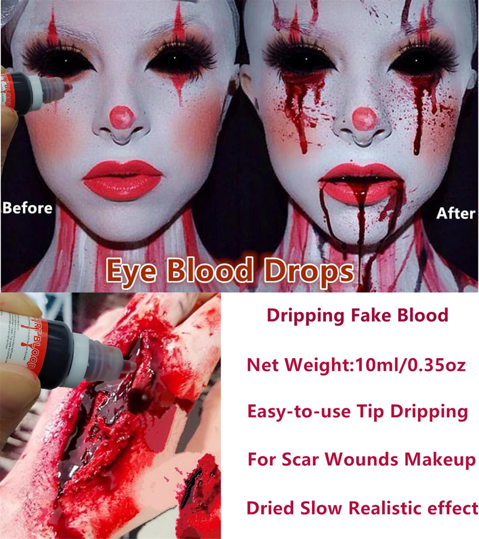 【Easy to Apply & Drip Down】Open the cap and paint it directly.Super smooth.Ideal for creating a range of realistic old wound looking injuries.Great Consistency.It will dry slowly(about 20-30 minutes)..When it dried,it will more darker.It will flows and runs like a real blood.It is great for eye blood,eye drops,nose bleeds.You can paint it directly on your face or neck to get a dripping down bloods.