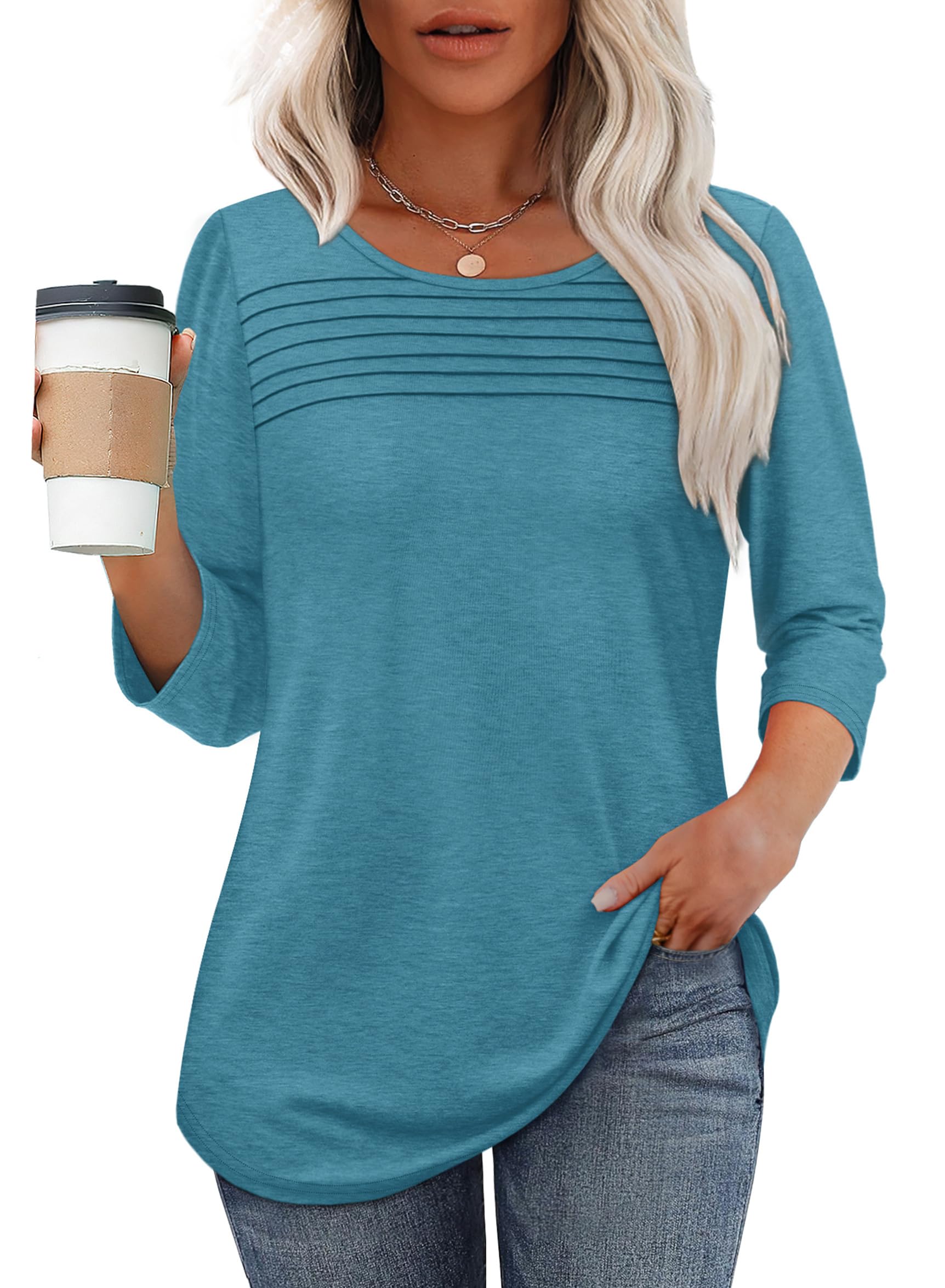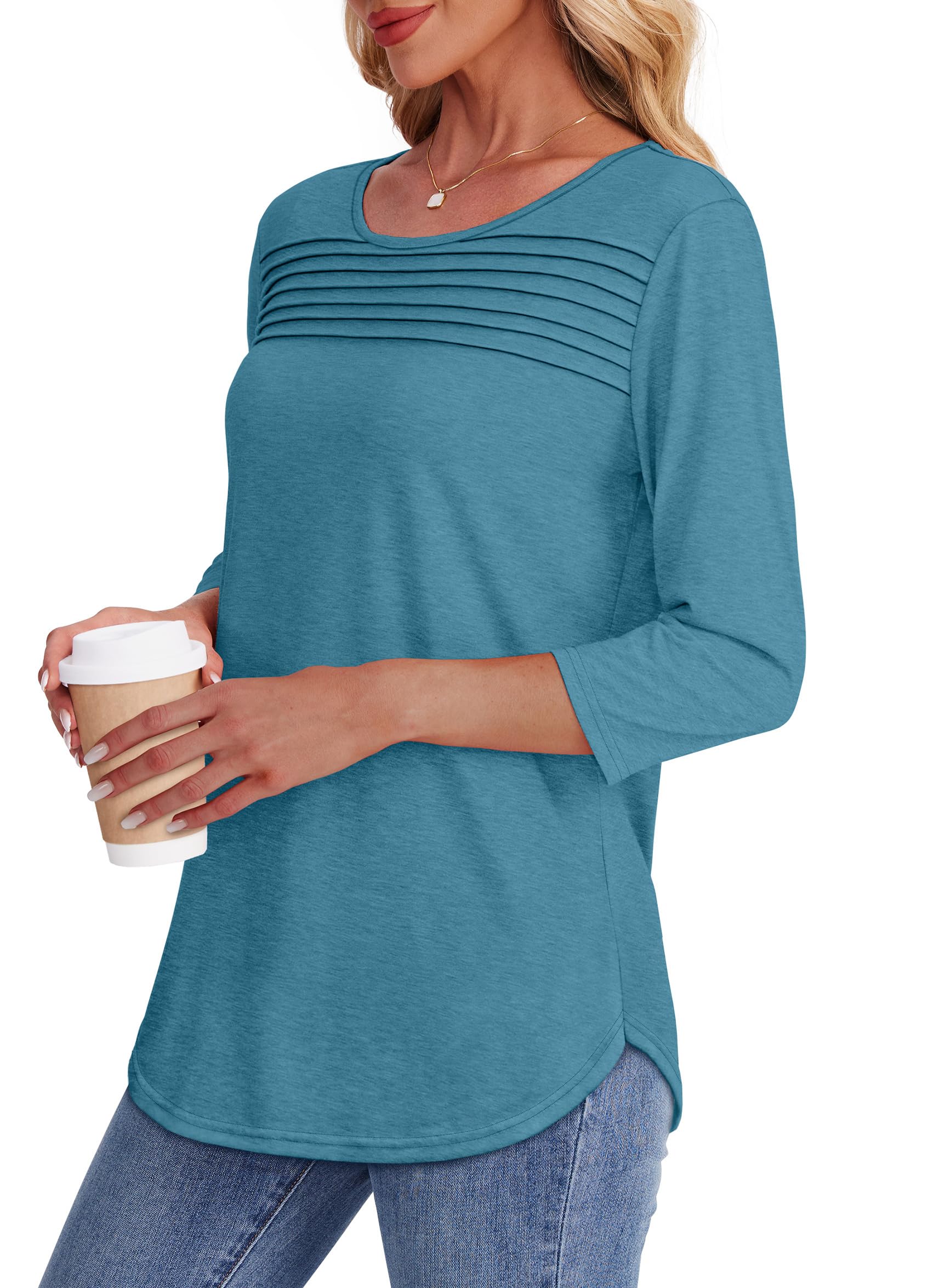 Great Features: 3/4 length sleeve womens tops,womens tops dressy casual,plus size women's clothing,blouses for women business casual,fall outfits for women 2025,adorable pleated front design,simple scooped neck with curved hemline