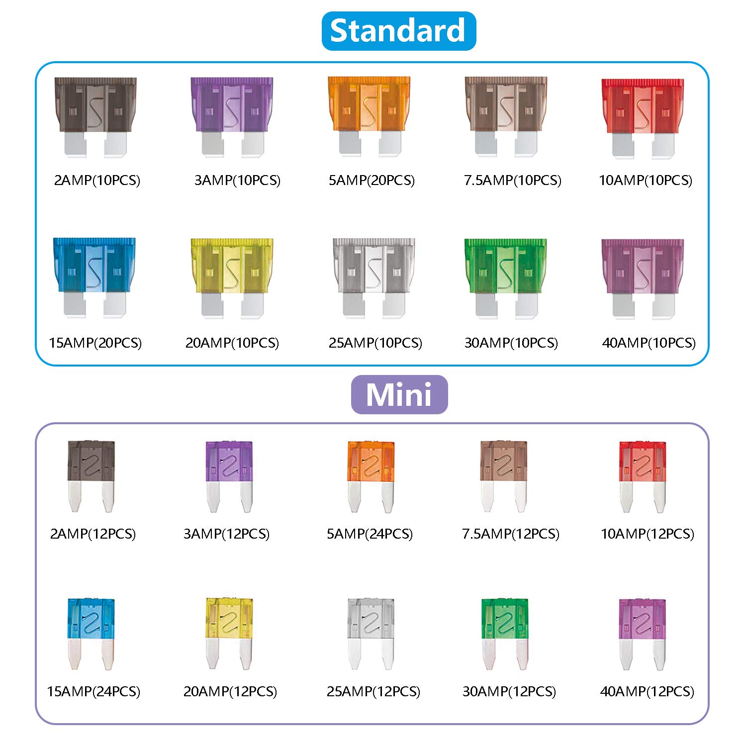 ll Sizes You Need: The package contains 264pcs blade fuses and 2pcs fuse puller - 132pcs standard fuse and 132pcs mini fuse