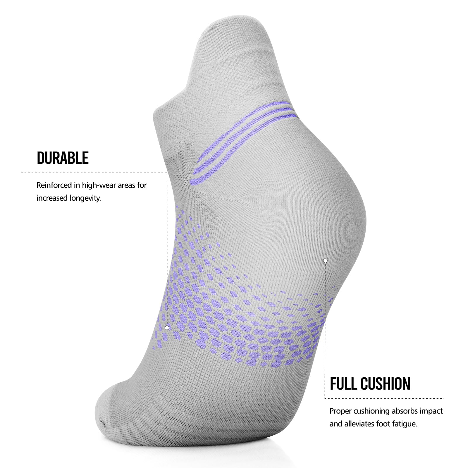 [CUSHION SOLE and ANTI-BLISTER]: Womens running socks with great soft cushion at the bottom, heel and toe areas to absorb shock and relieve foot pain. The Y-stitched heel pocket and elasticated band prevents socks from slipping and blisters from forming