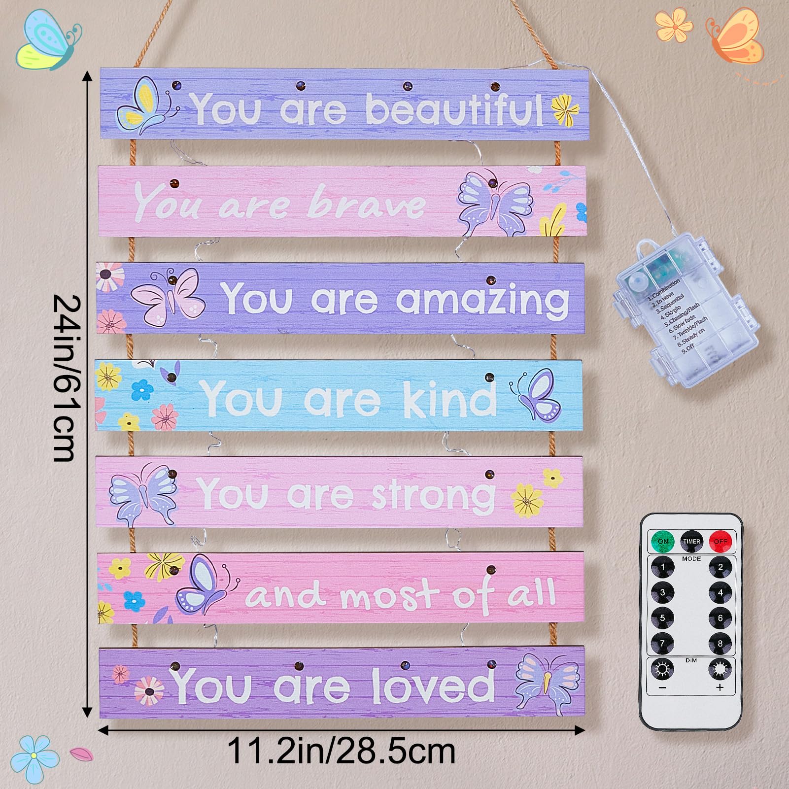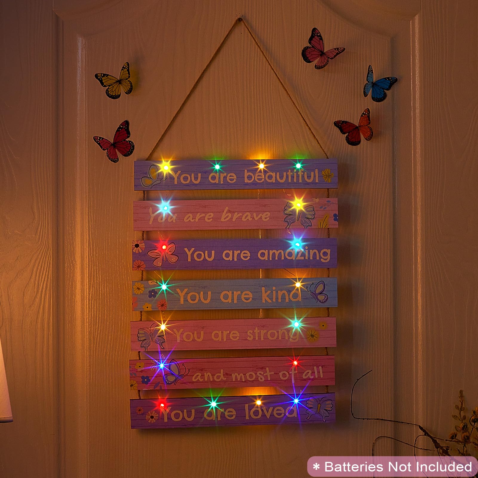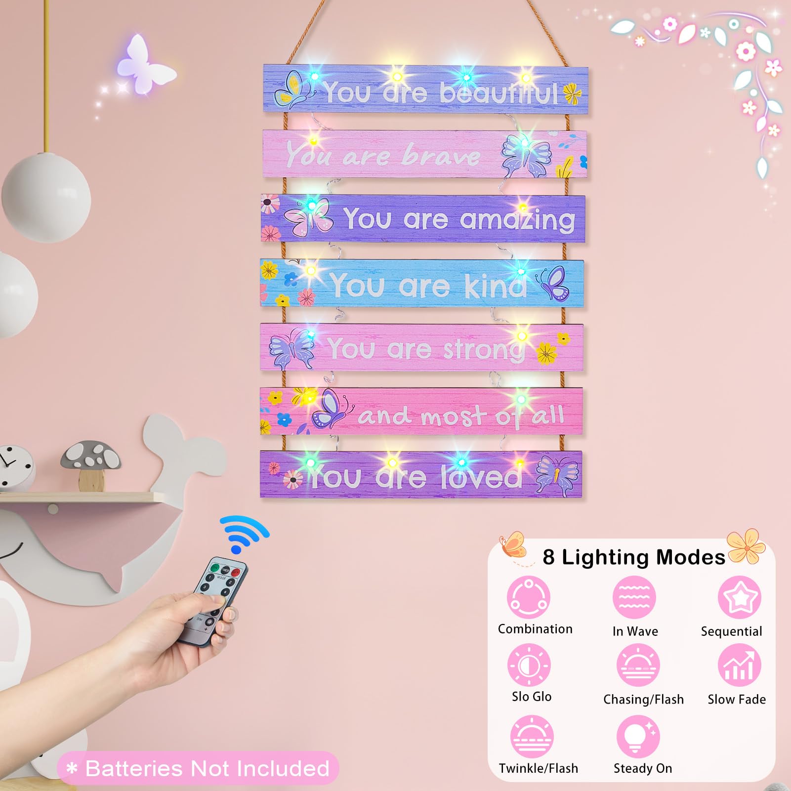 Package: The play room decor for kids package includeds 1 pcs girls room decor board, 1 pcs LED light with empty battery box (not including batteries), 1 pcs remote control (not including batteries), both do not including batteries, need to be purchased by customers themselves