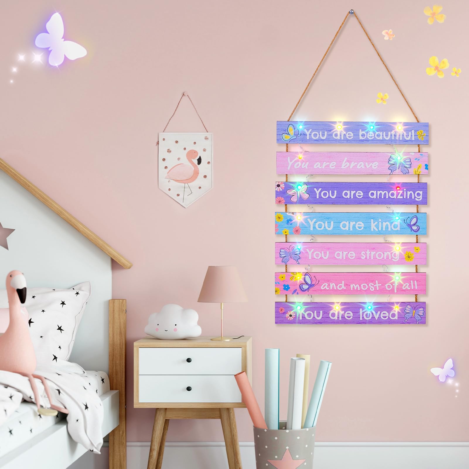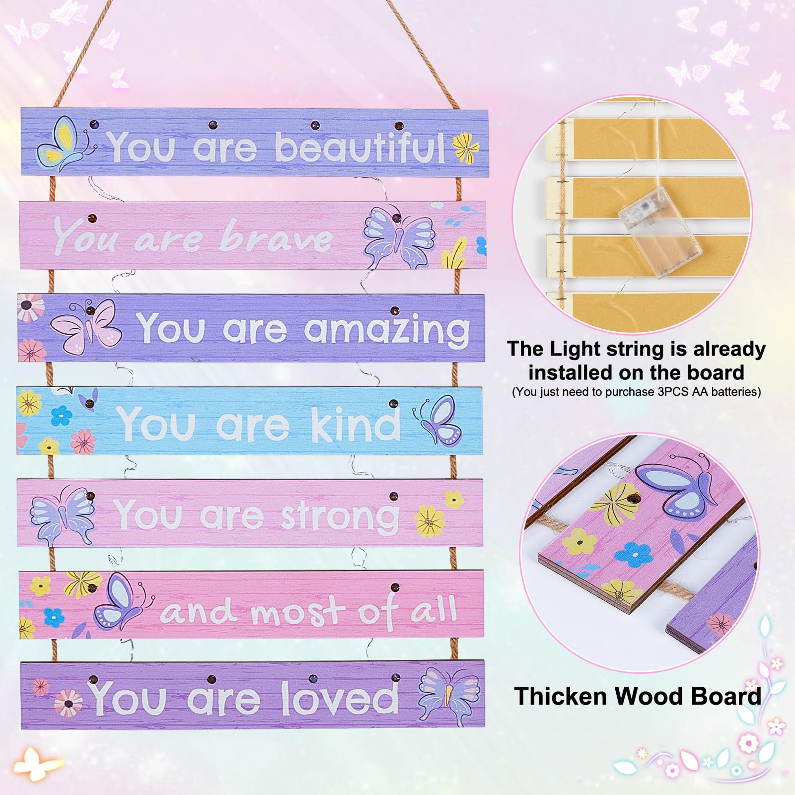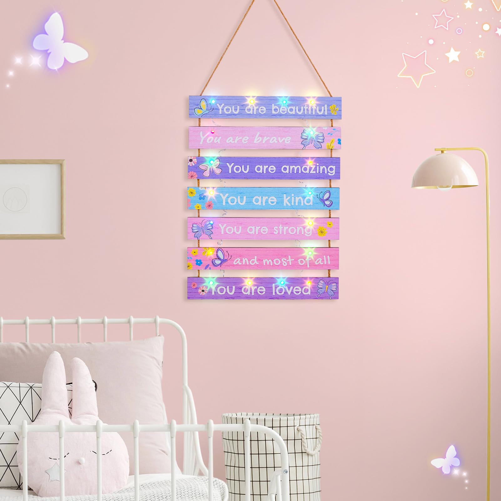Package: The play room decor for kids package includeds 1 pcs girls room decor board, 1 pcs LED light with empty battery box (not including batteries), 1 pcs remote control (not including batteries), both do not including batteries, need to be purchased by customers themselves