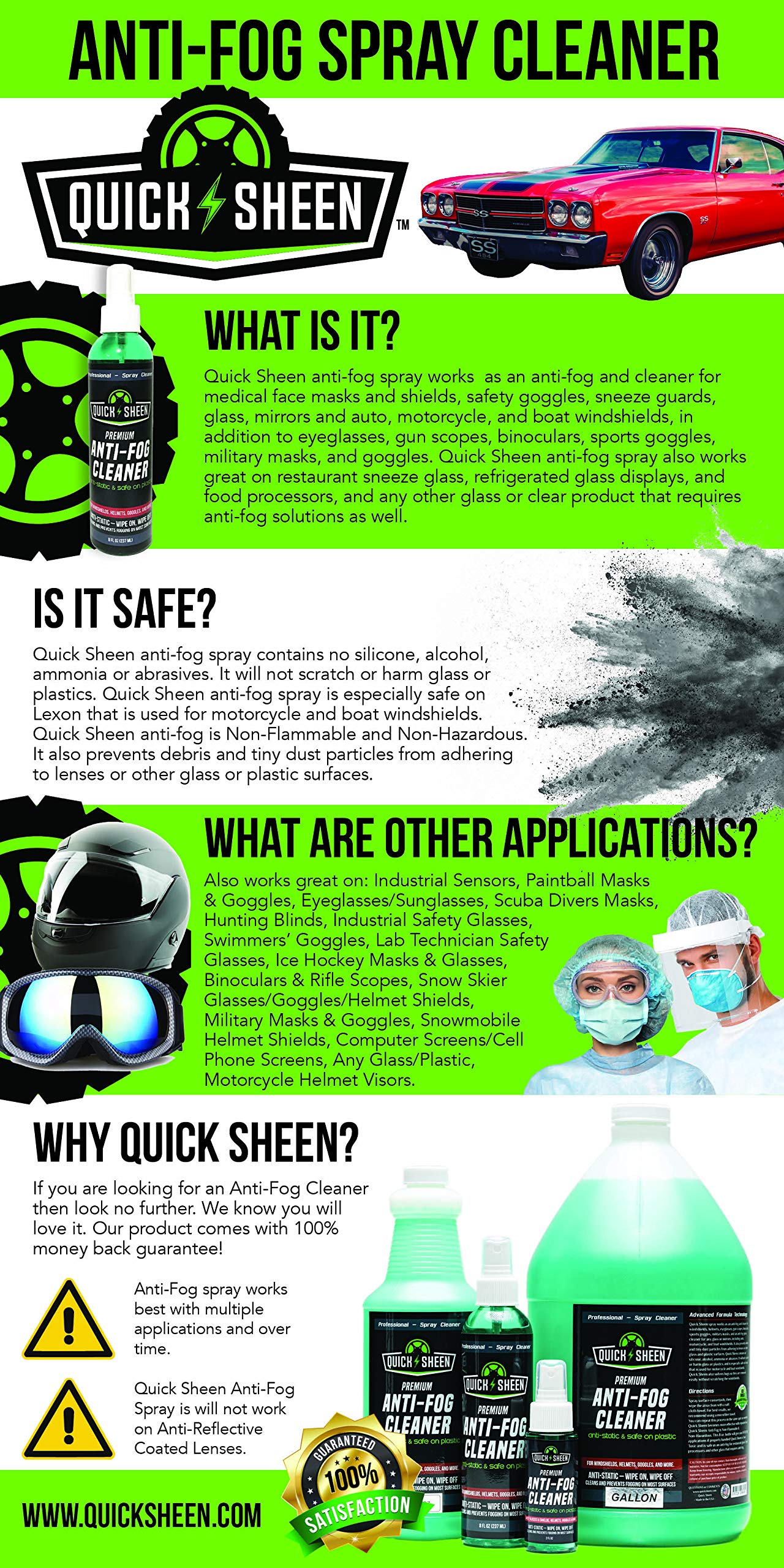 ✅ Quick Sheen anti-fog spray works as an anti-fog and cleaner for medical face masks and shields, safety goggles, sneeze guards, glass, mirrors and auto, motorcycle, and boat windshields, in addition to eyeglasses, gun scopes, binoculars, sports goggles, military masks, and goggles. Quick Sheen anti-fog spray also works great on restaurant sneeze glass, refrigerated glass displays, and food processors, and any other glass or clear product that requires anti-fog solutions as well.