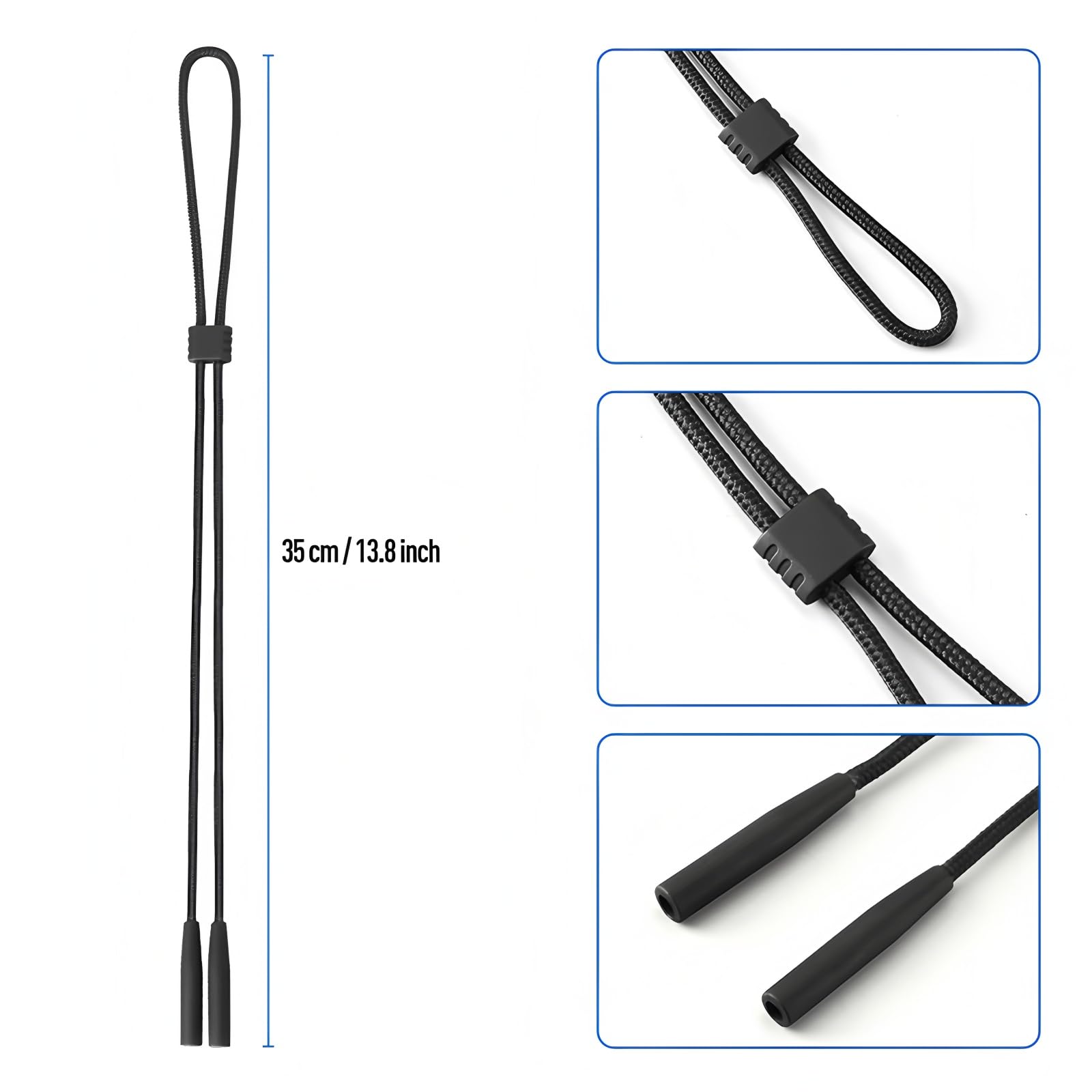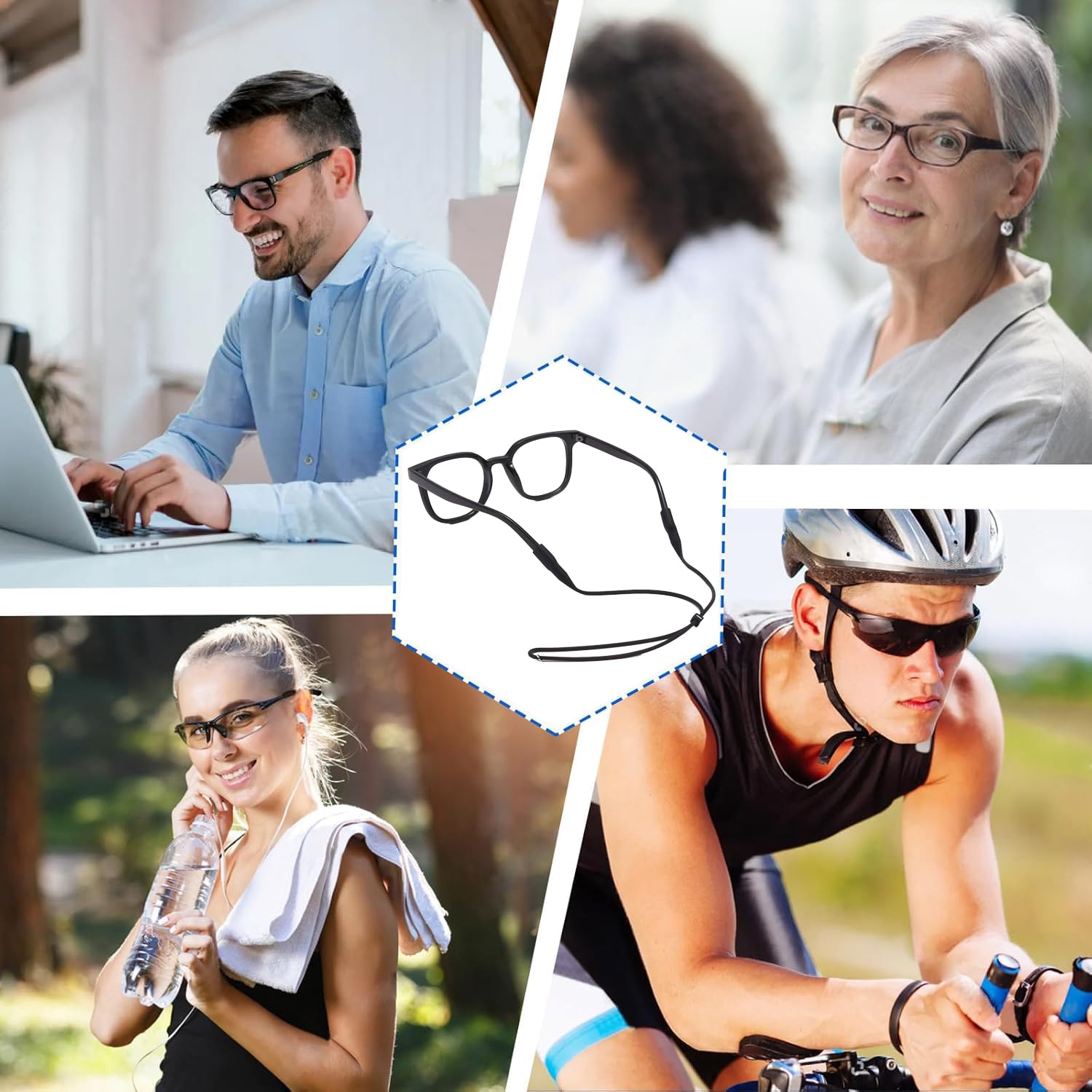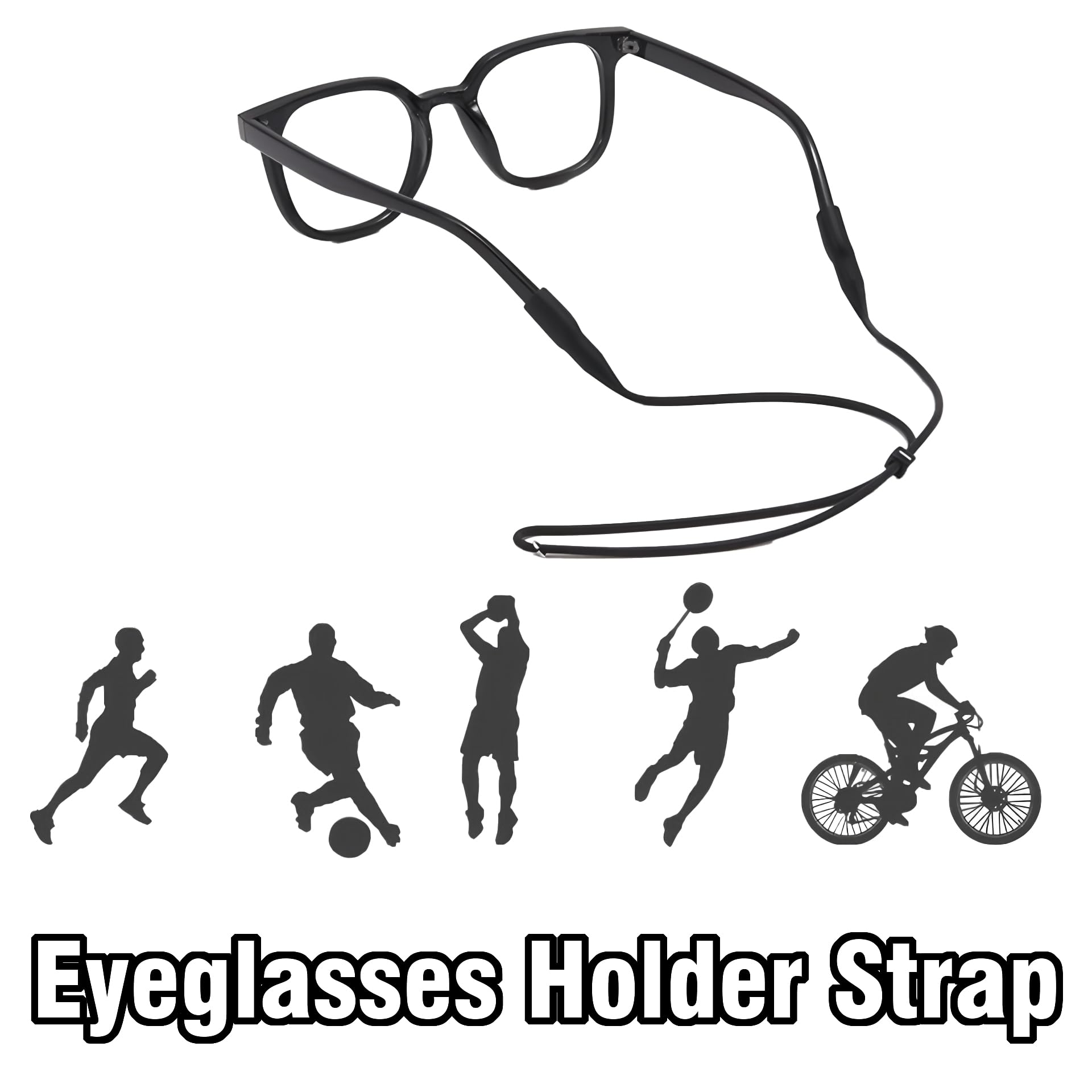 Description Our adjustable eyeglass holder straps are crafted for the explorers, the commuters, the weekend adventurers, and everyone who wants to keep their eyewear exactly where it belongs: right by your side. Product Features Highlights 🔒 Secure Fit for Every Activity High-elastic silicone grips keep your glasses in place during fishing, cycling, running, or hiking — no more sliding, falling, or losing your eyewear. 🎯 Adjustable Length, Universal Fit Easily adjust the strap for a snug or relaxed fit. One size truly fits all — men, women, and children included. 🧵 Soft, Durable & Skin-Friendly Made from premium polyester-elastic fabric that's breathable and feather-light. You’ll forget you’re even wearing it. ♻️ Reusable, Washable & Eco-Friendly Simply rinse and reuse. Our strap is made to last through years of everyday wear. 👓 Works with Any Eyewear Compatible with reading glasses, sunglasses, sports goggles, and safety glasses. A smart choice for daily life or outdoor adventures. Perfect for: ✔ Sports & Fitness Activities ✔ Beach Days & Watersports ✔ Commuting & Driving ✔ Work & Study ✔ Outdoor Adventures ✔ Travel, Boating, Camping How to Use Insert one temple arm of your glasses into the silicone loop. Repeat with the other side. Adjust the strap to your preferred length using the sliding buckle. Ready to wear — around the neck or secured on your head.