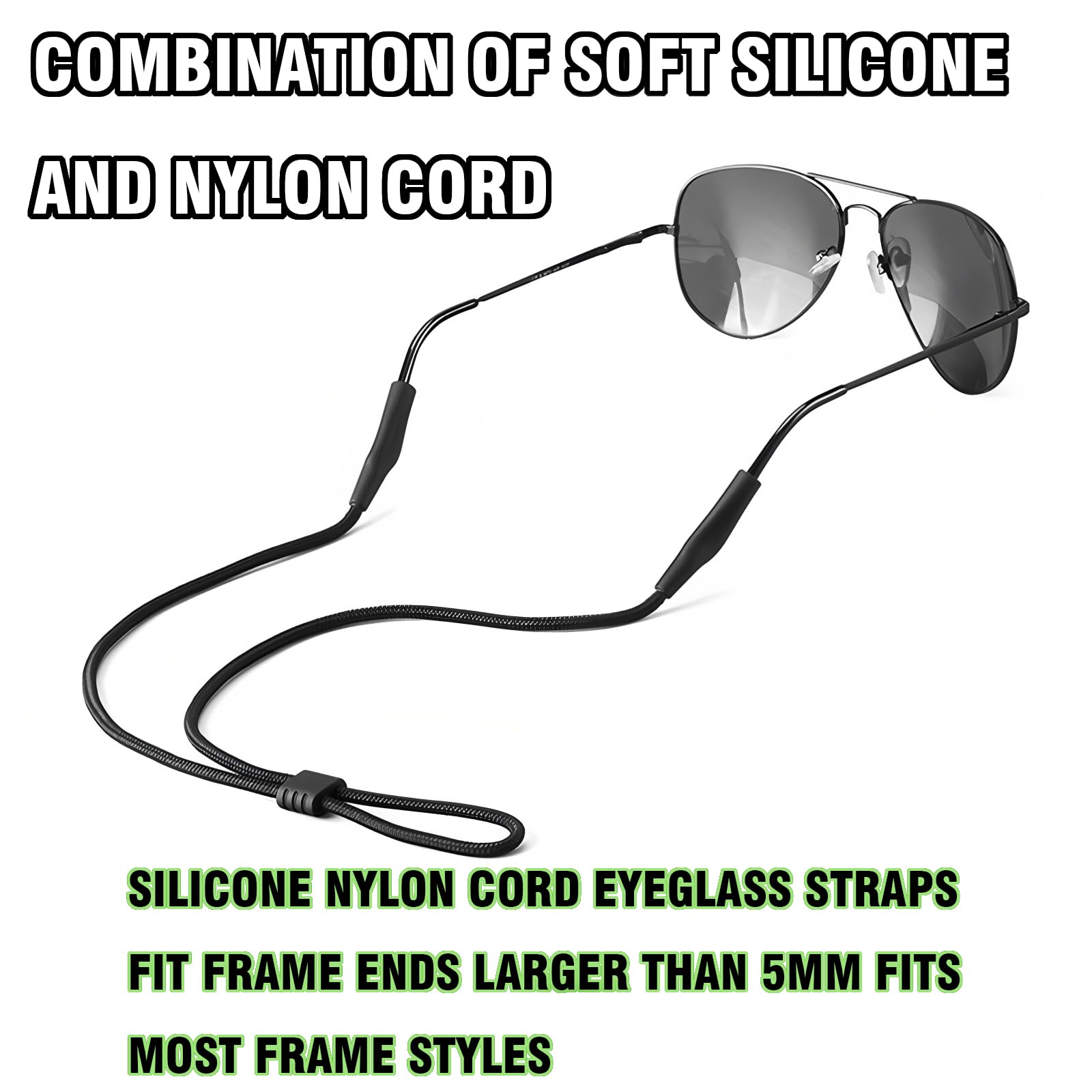 【Secure & Reliable Fit for All Activities】 Keep your sunglasses or eyeglasses safe and secure with our premium glasses strap — perfect for fishing, biking, hiking, skiing, sports, or daily wear. The high-elastic silicone ends hold tightly to most frame temples (compatible with temples wider than 4.5mm), ensuring your glasses stay put during active movement.