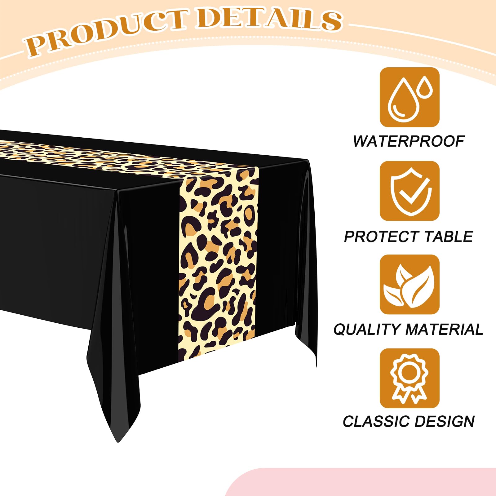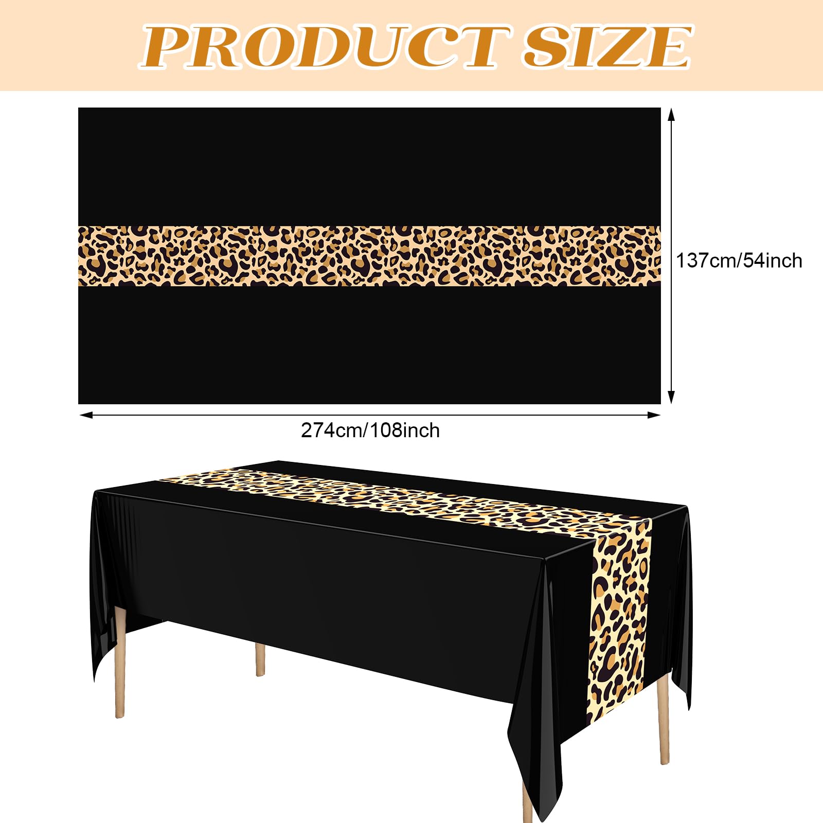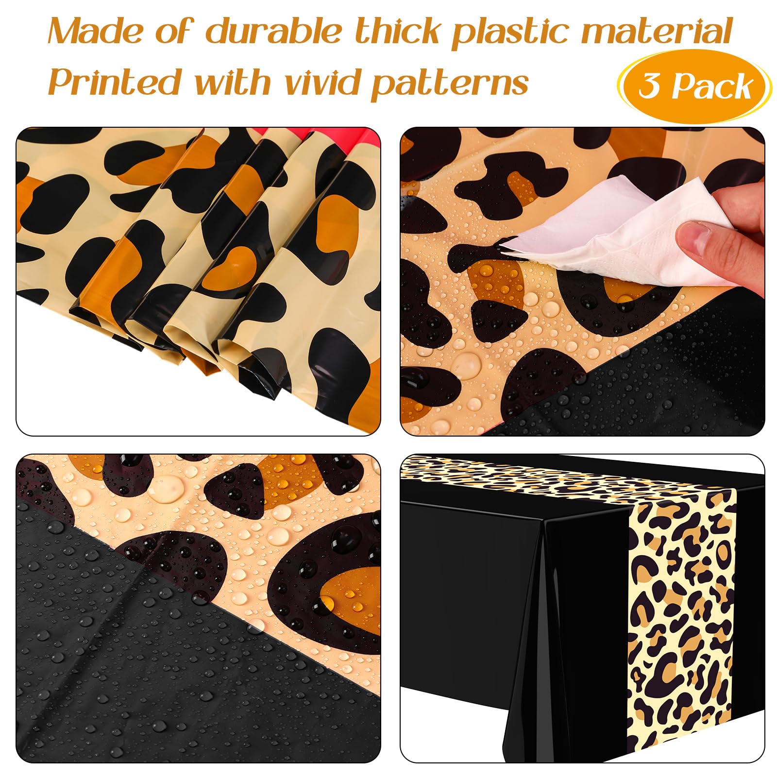 Reliable Material: these leopard print tablecloths are crafted with quality plastic that ensures durability; They are not only soft and flexible, but also resist fading; The waterproof property makes it an ideal choice keeping your table away from stain