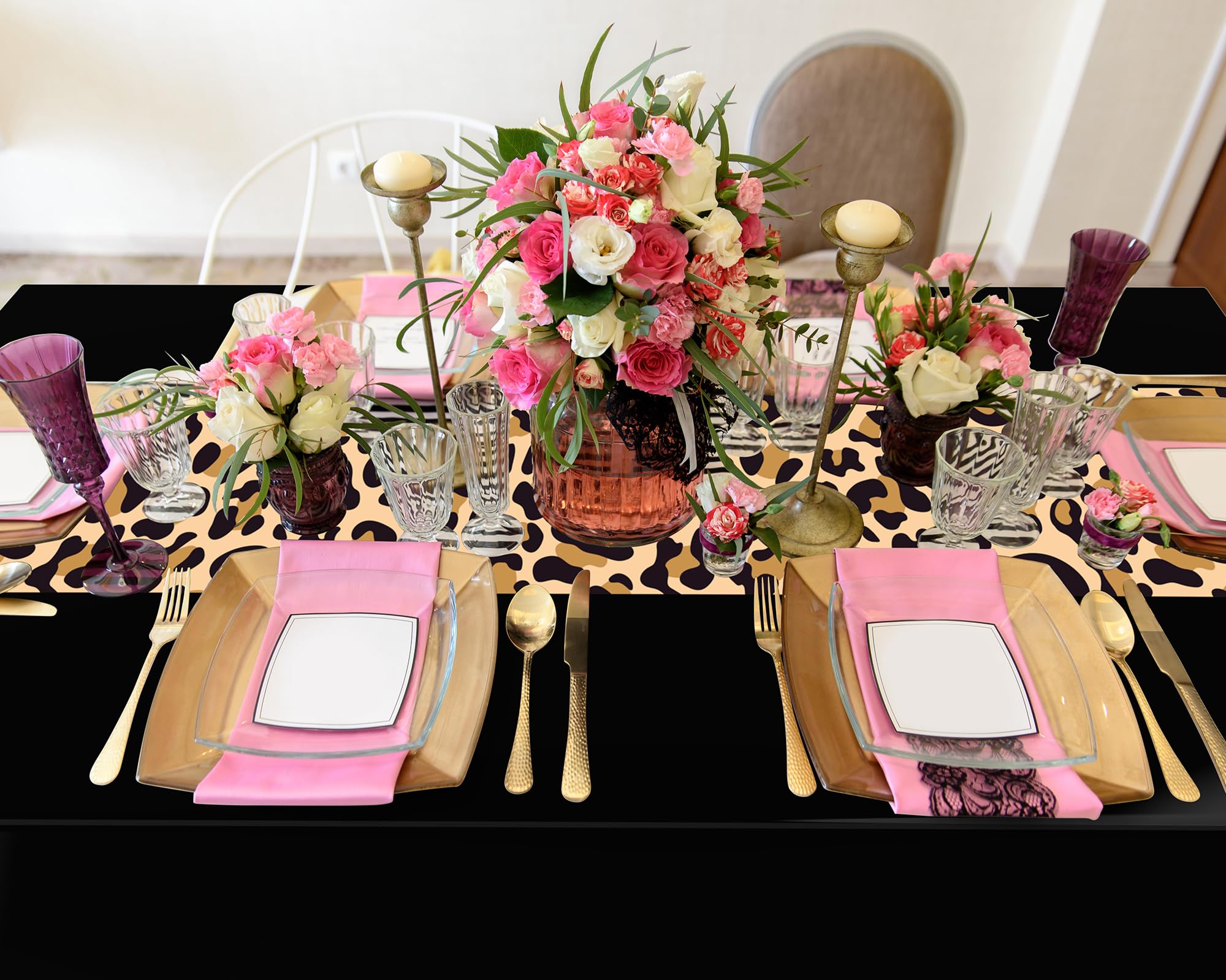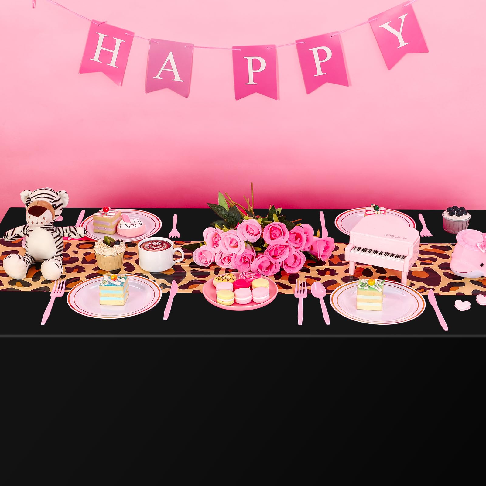 Eye Catching Design: featuring a vibrant leopard pattern overlaid on a black backdrop, these animal tablecloths are sure to attract attention; The novel design, paired with bold colors, can add an extra touch of elegance to your party decoration